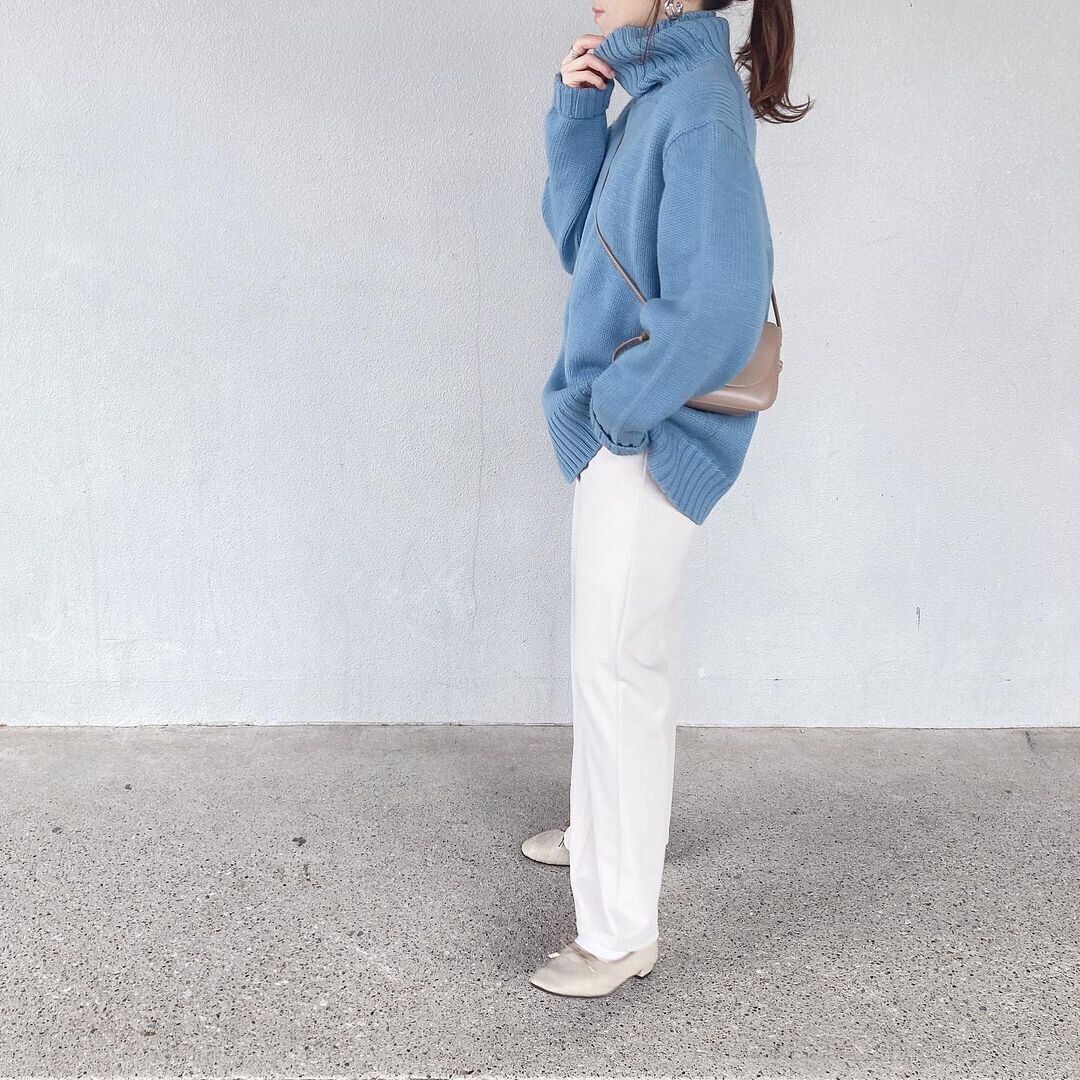 カラーで顔まわりが華やかになれるタートルネックニット