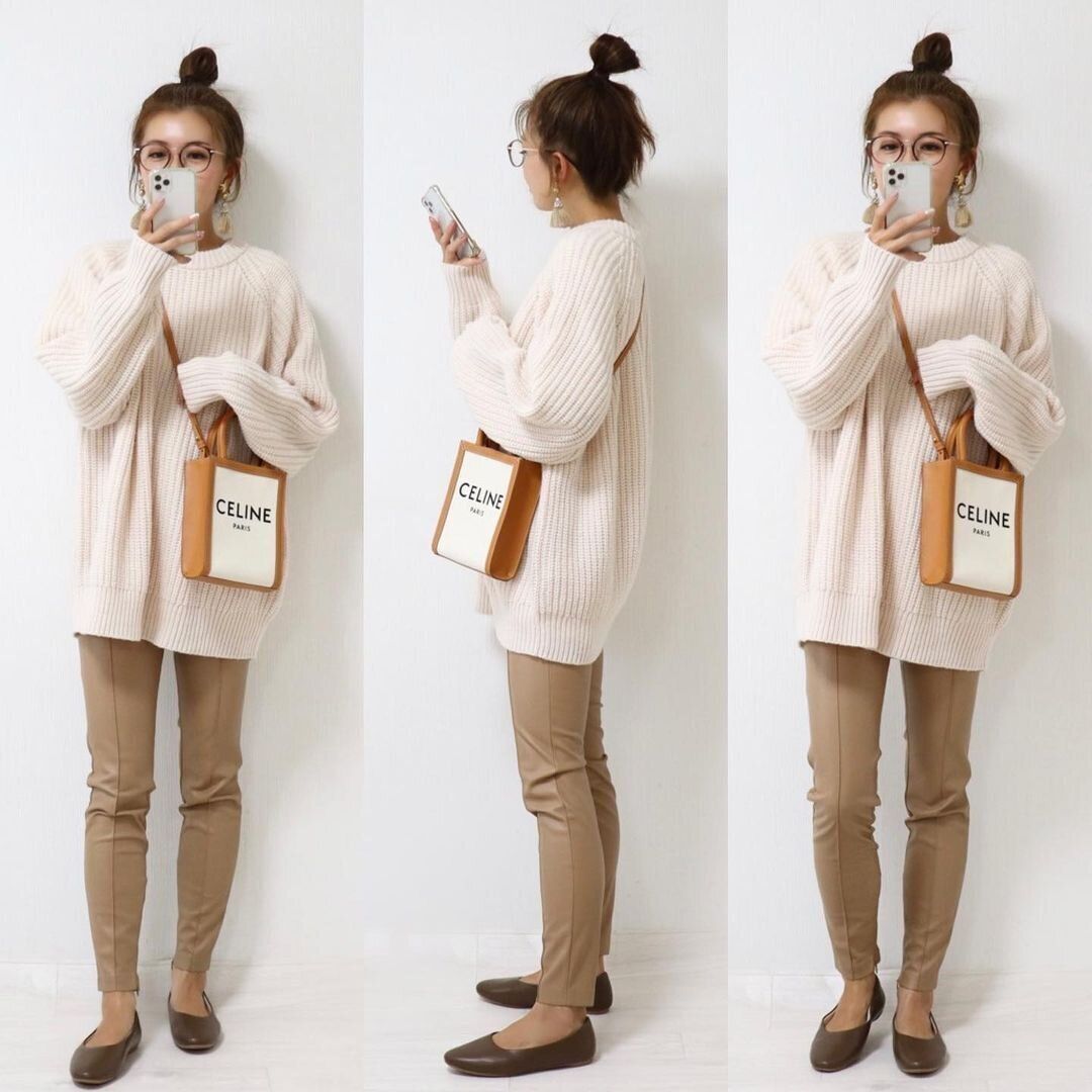 ふんわりとしたスフレヤーンニットは、ウエストイン・アウト両方できる点も便利です。ボトムに合わせて着こなしをアレンジできる楽しみも。