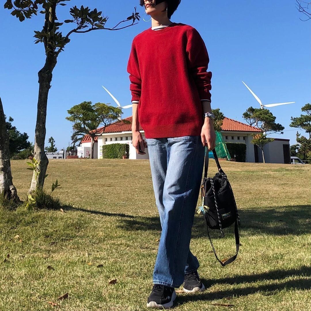 思いきりサイズアップさせて着こなすと、シルエットが変わって抜け感もアップ!こちらは「プレミアムラムクルーネックセーター」(1,990円/2020年12月17日まで期間限定価格)のXLサイズを着用しています。ふだん着るサイズよりも大きめを選ぶと、肩の力を抜いたリラックス感溢れる着こなしが実現するのです。