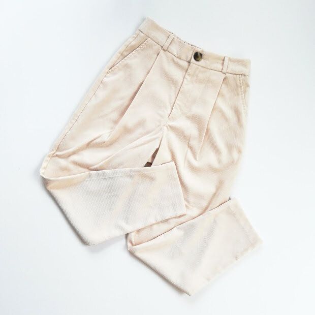 腰まわりがすっきり見えるタック入りと、美脚に見せてくれるテーパードラインが魅力!