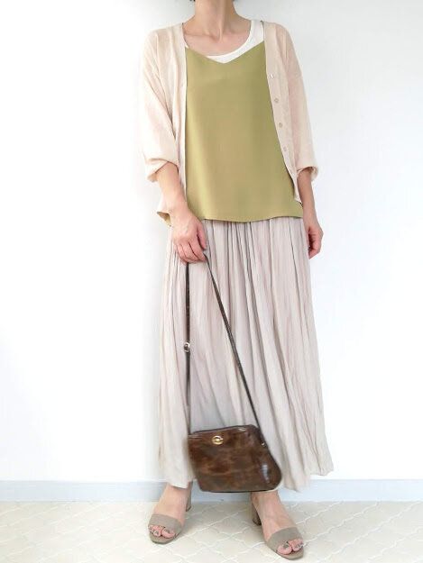 カーディガンのインナーに、女らしさをプラスしてくれるキャミソールがイチオシ!胸元の開きが気になるなら、タンクトップの上に重ねるのがおすすめ。