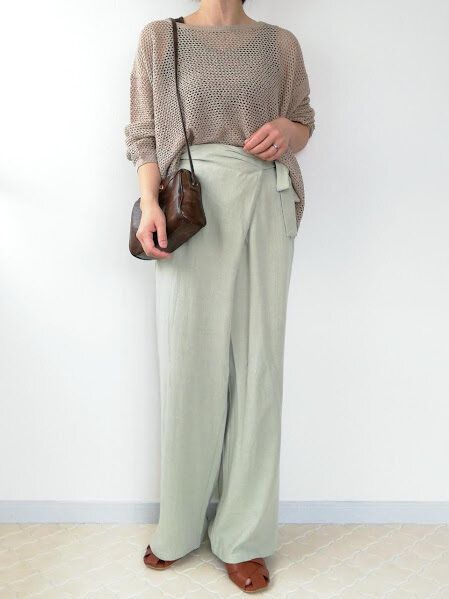 編み目の大きいメッシュニットも今季のトレンドアイテム。ゆるっとしたメッシュニットは、夏も涼しく着られて◎。落ち着いた印象のベージュニット×ライトグリーンのパンツで、大人のワントーンコーデの完成です!