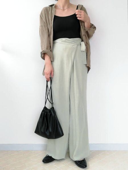ライトカラーのワイドパンツ、膨張して見えるのを防ぐのには「ブラック」合わせが効果的!インナー・バッグ・靴をブラックで統一して、すっきりクールな大人カジュアルコーデに。