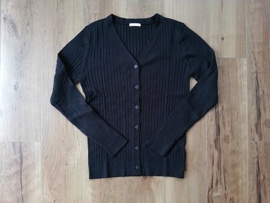 GUの「ワイドリブVネックカーディガン」は、流行を問わず長く着られるベーシックなシルエット。開きすぎずつまりすぎない、絶妙なVネックが抜け感を演出してくれます。