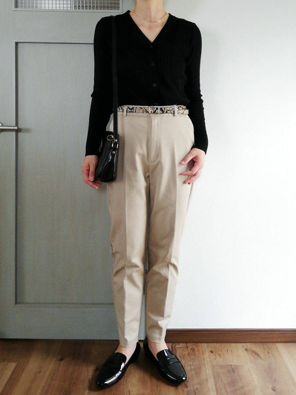 ツヤ感あるローファーや、パイソン柄ベルトでアクセントをプラス。