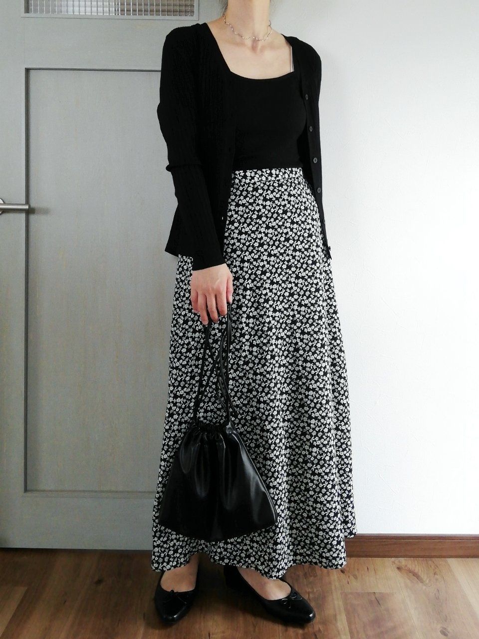 トレンドの小花柄ロングスカートも、モノトーンで統一すればシックで大人らしい雰囲気になって◎。華奢なネックレスが、女らしさをさらに盛り上げます。