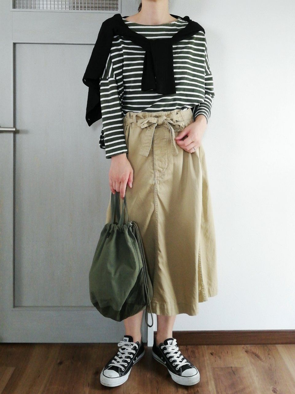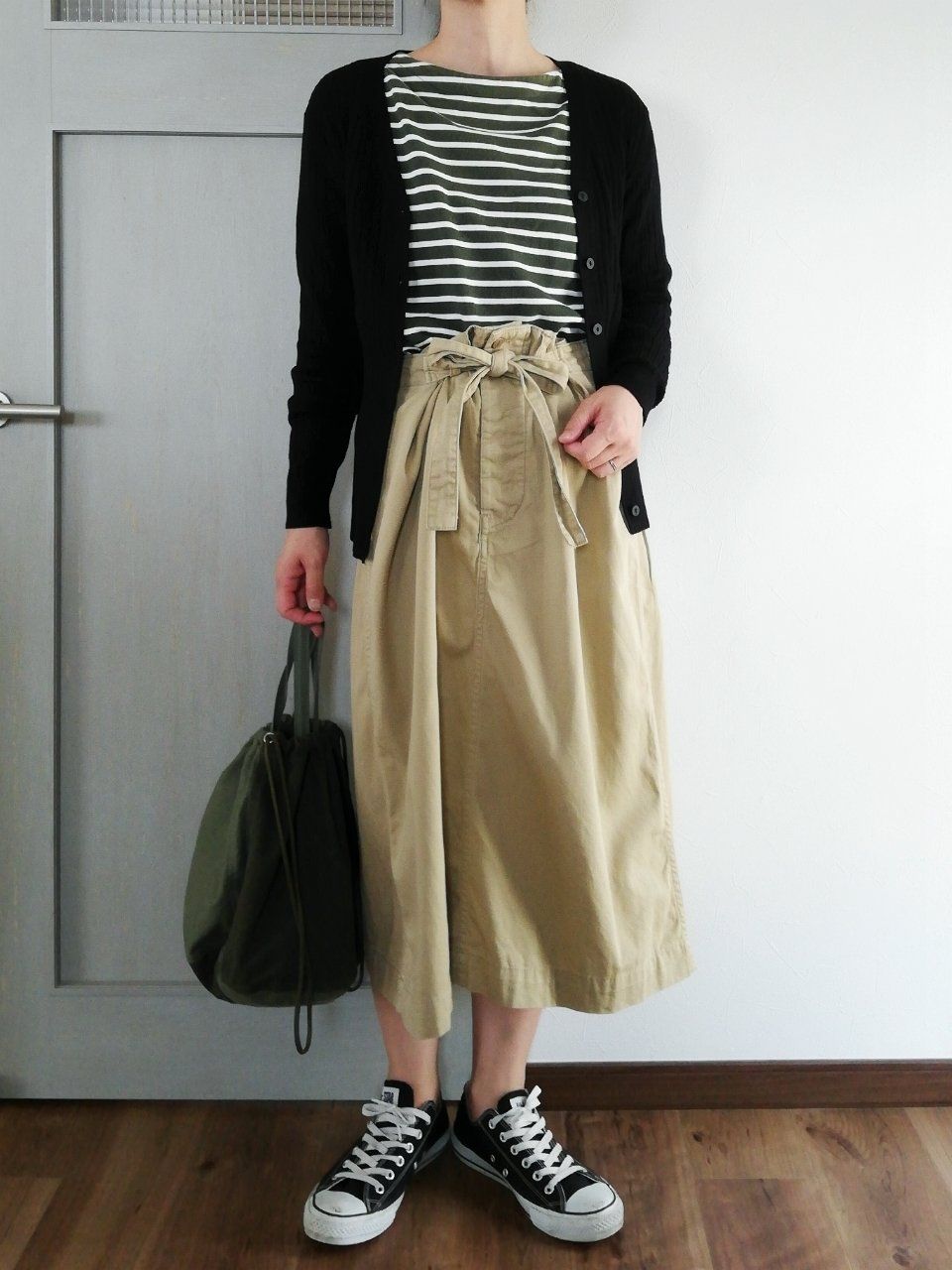 ボーダー×チノスカートのカジュアルコーデ。プレーンなカーディガンは、どんなコーデにもなじんでくれる強い味方!