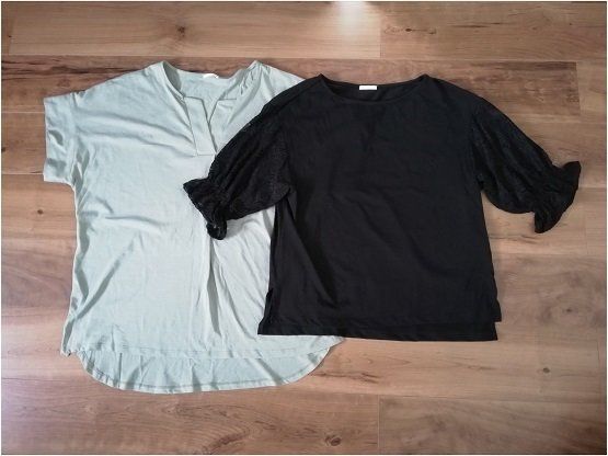 左からスキッパーオーバーサイズT(¥990)、レーススリーブT(¥590)。オーバーサイズが抜け感のあるスキッパーTと華やかな袖レースT、どちらも1枚でサマになるデザインがポイント。