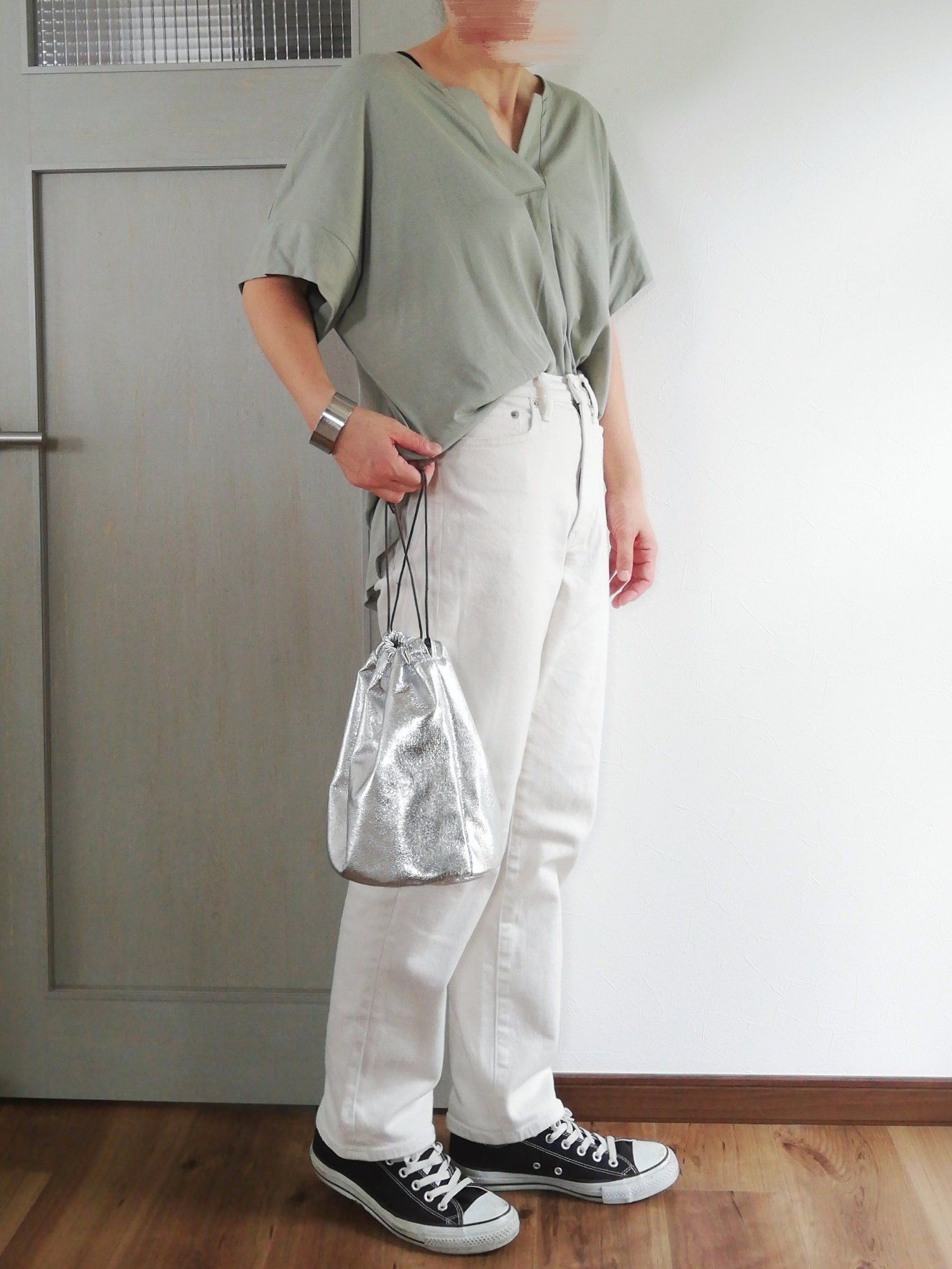 上下ライトカラーなコーデには、黒スニーカーや鮮度高めのシルバー小物でアクセントをプラスすると、ぼんやり見えず新鮮なコーディネートになります。