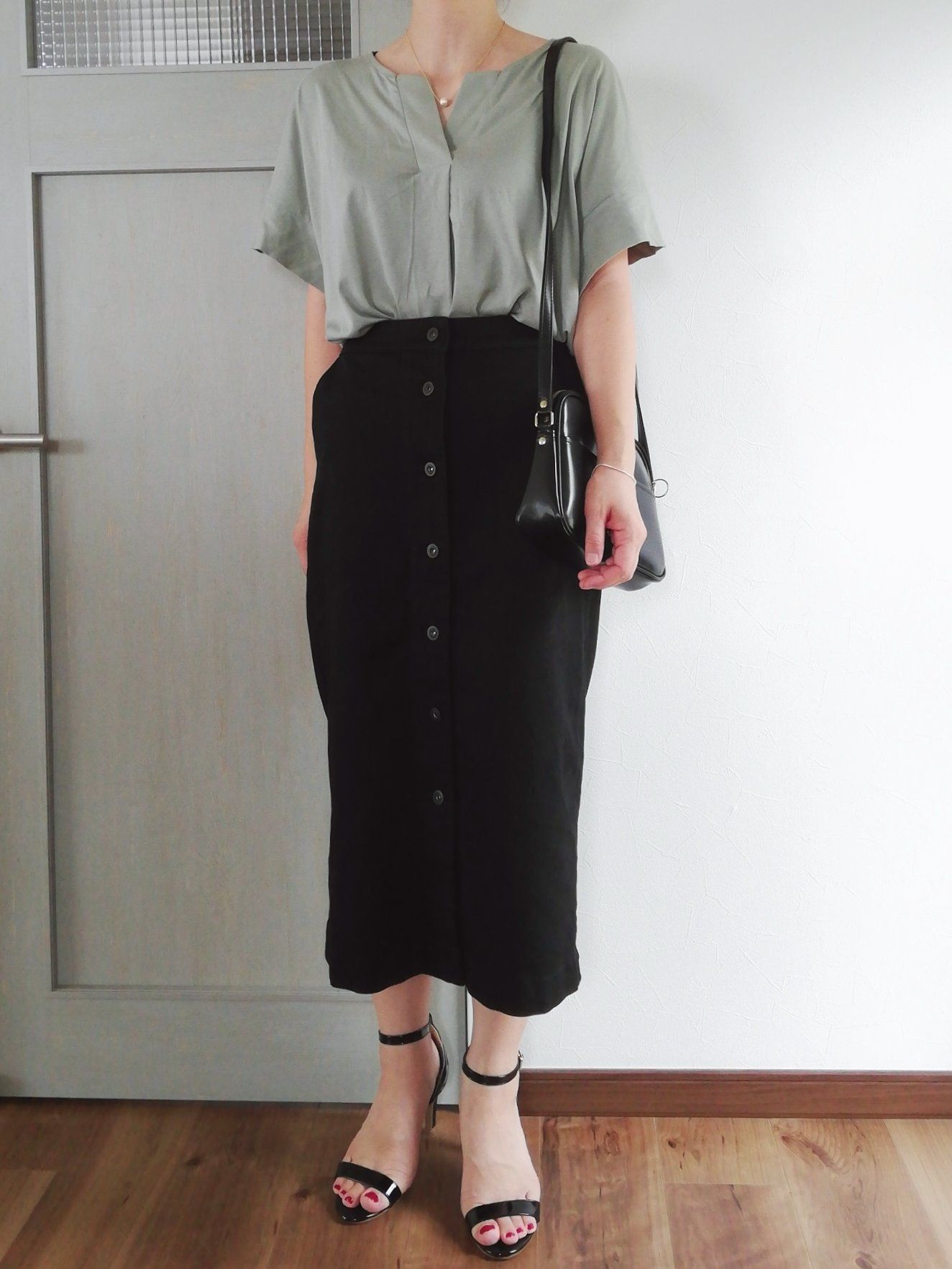 カジュアルに寄りがちなオーバーサイズTですが、スキッパーデザインを活かせば、きれいめコーデにシフト可能!タイトスカートにインしてすっきりIラインコーデに。