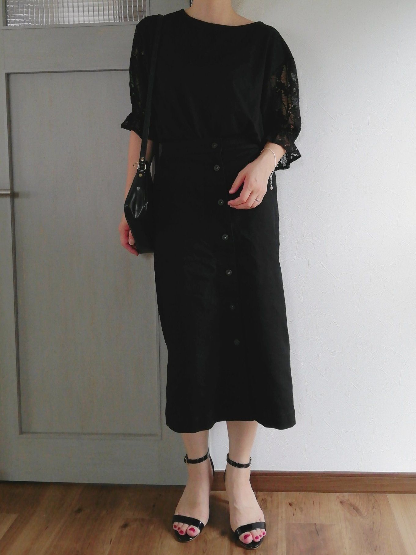 オールブラックでまとめたきれいめ大人コーデ。袖レースが引き立ち、地味すぎずワントーンコーデに華やかな雰囲気をプラスしてくれます。
