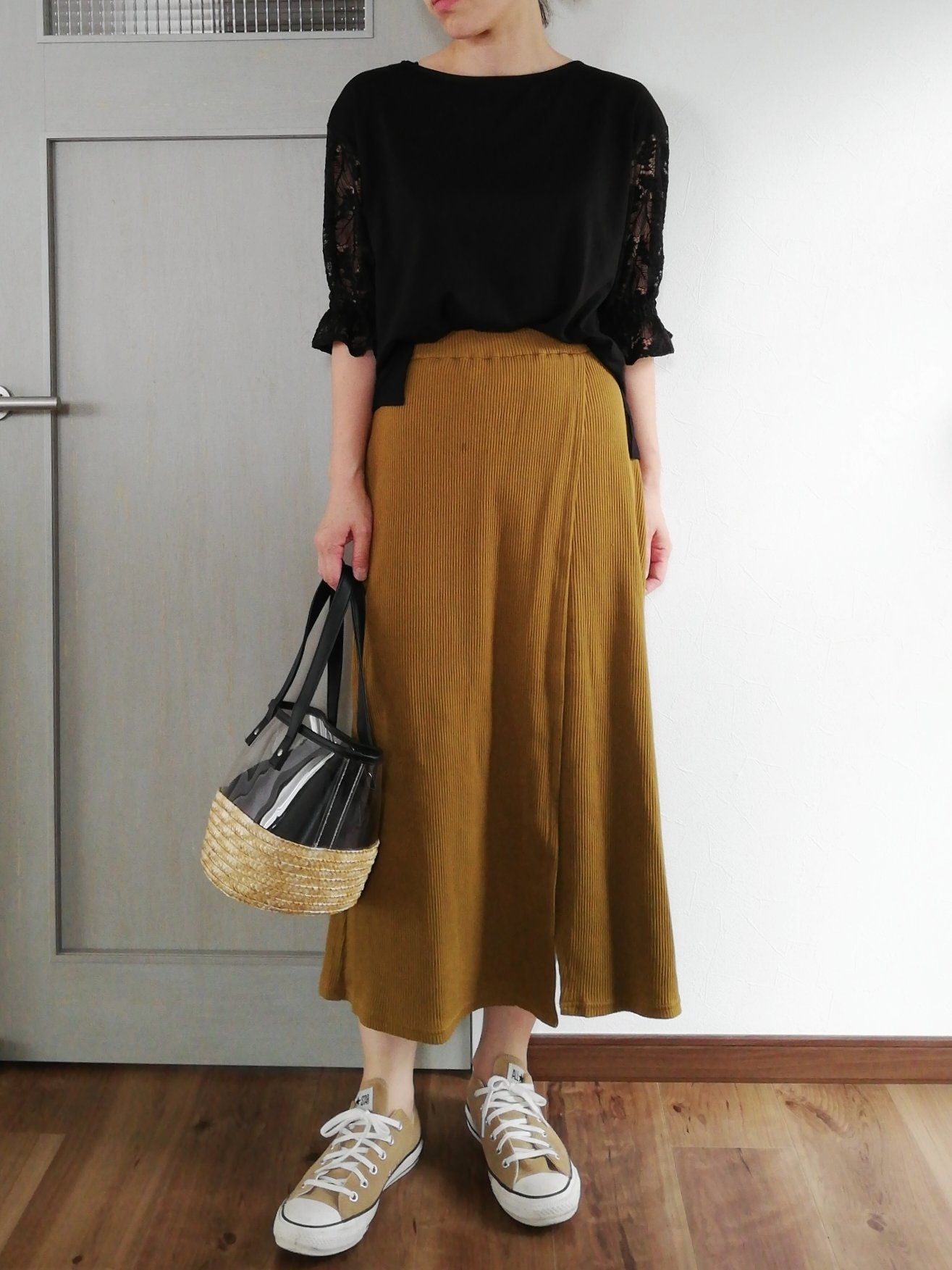 カジュアルさのあるリブ素材のスカートに合わせたOFFコーデ。ロング丈のスカートで大人らしさをキープ。