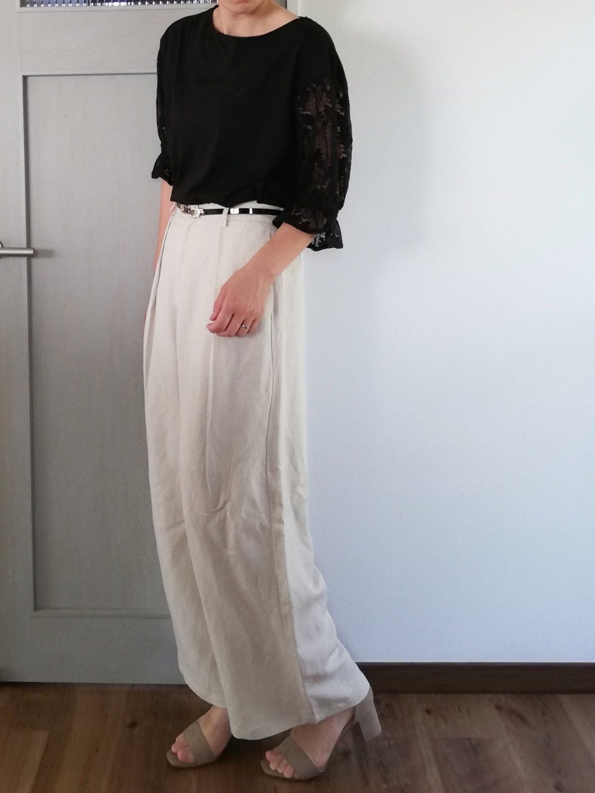 黒トップスに合わせるパンツは、軽さを出してくれる白がおすすめ。リネン素材のきれいめワイドパンツなら大人の夏コーデにぴったり!