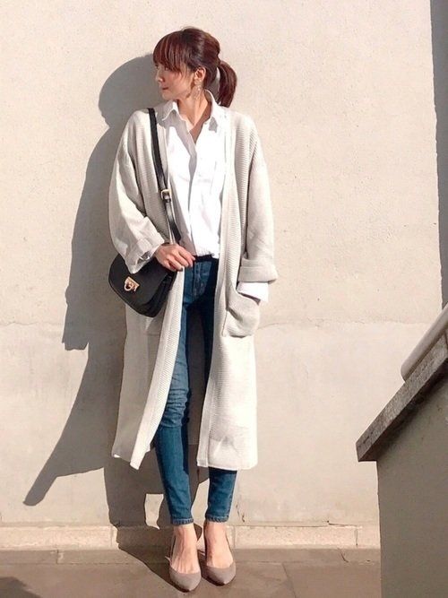 トレンドのマキシ丈カーディガンはコーディネートにこなれ感を与えてくれるアイテム。ユニクロのベーシックな白シャツをインナーにすると、ほどよいきちんと感がプラスされて大人っぽい印象に。レザーバッグやパンプスの小物使いできれいめ大人カジュアルコーデが完成!パンプスはGUのもの。