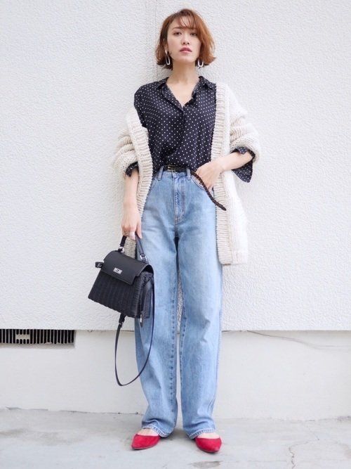 温かみがあるオーバーサイズのざっくりカーディガンのインナーにユニクロのドットブラウスを。ほっこりコーデになりがちなバルキーニットカーディガンを、てろんとしたドットシャツで大人めにシフト。ハイウエストデニムにインしてこなれ感ある着こなしに。カーディガンはTODAYFULのもの。