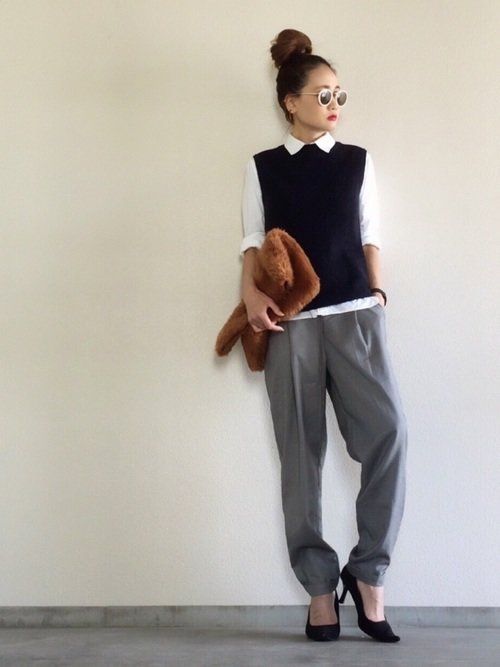 ニットベスト×ユニクロシャツのコーデ。じわじわと人気急上昇中のベストは、シャツをレイヤードするとトラッドな印象に。パンプスで女らしさをプラスして大人のトラッドコーデが完成!ベストはGUのもの。