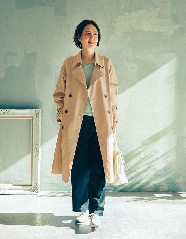 季節の変わり目にあると便利なアウターとして、林さんがこの春イチオシなのがオーバーサイズのトレンチ。「ゆったりとしたシルエットととろみのある生地感で40代の私たちにも着こなしやすいデザイン。トレンチというベーシックなアイテムなのに、オーバーサイズなのがいい!中にインナーダウンを重ねれば冬の終わりから着られるし、重ね着しやすい1枚です」。
