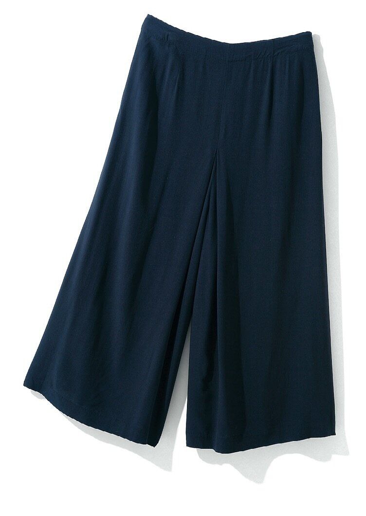 超定番の黒パンツも、太め&短めなら新鮮な印象に。個性的な形だけれど、色が黒だから、いつものトップスや靴に合わせやすい。「レーヨンスカートパンツ」(ブラック無地・全1色)/ユニクロ/イネス・ド・ラ・フレサンジュ
