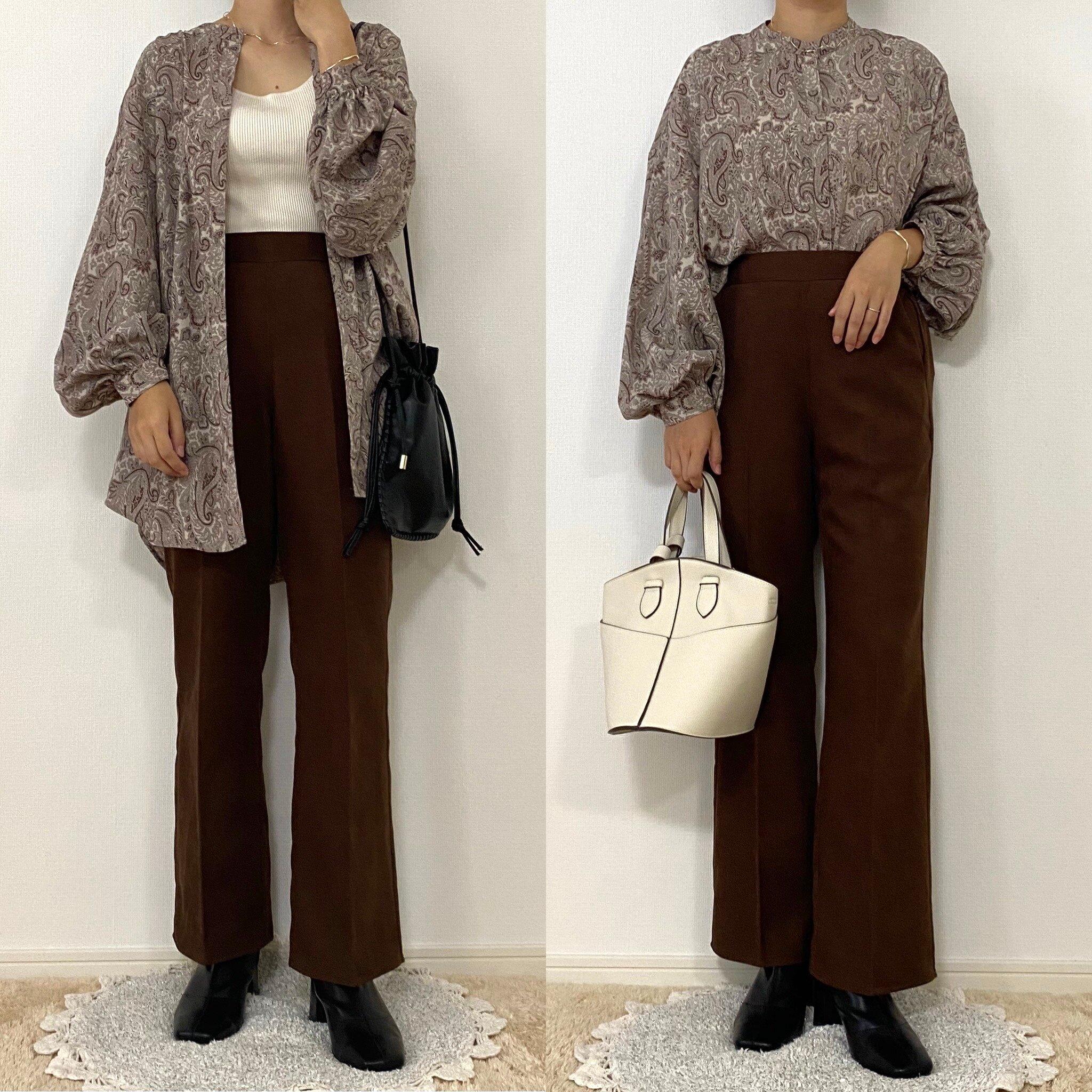 シャツと同じブラウンのパンツに合わせてみました。ゆるっとしたシルエットなので羽織にもちょうど良いサイズ感です。