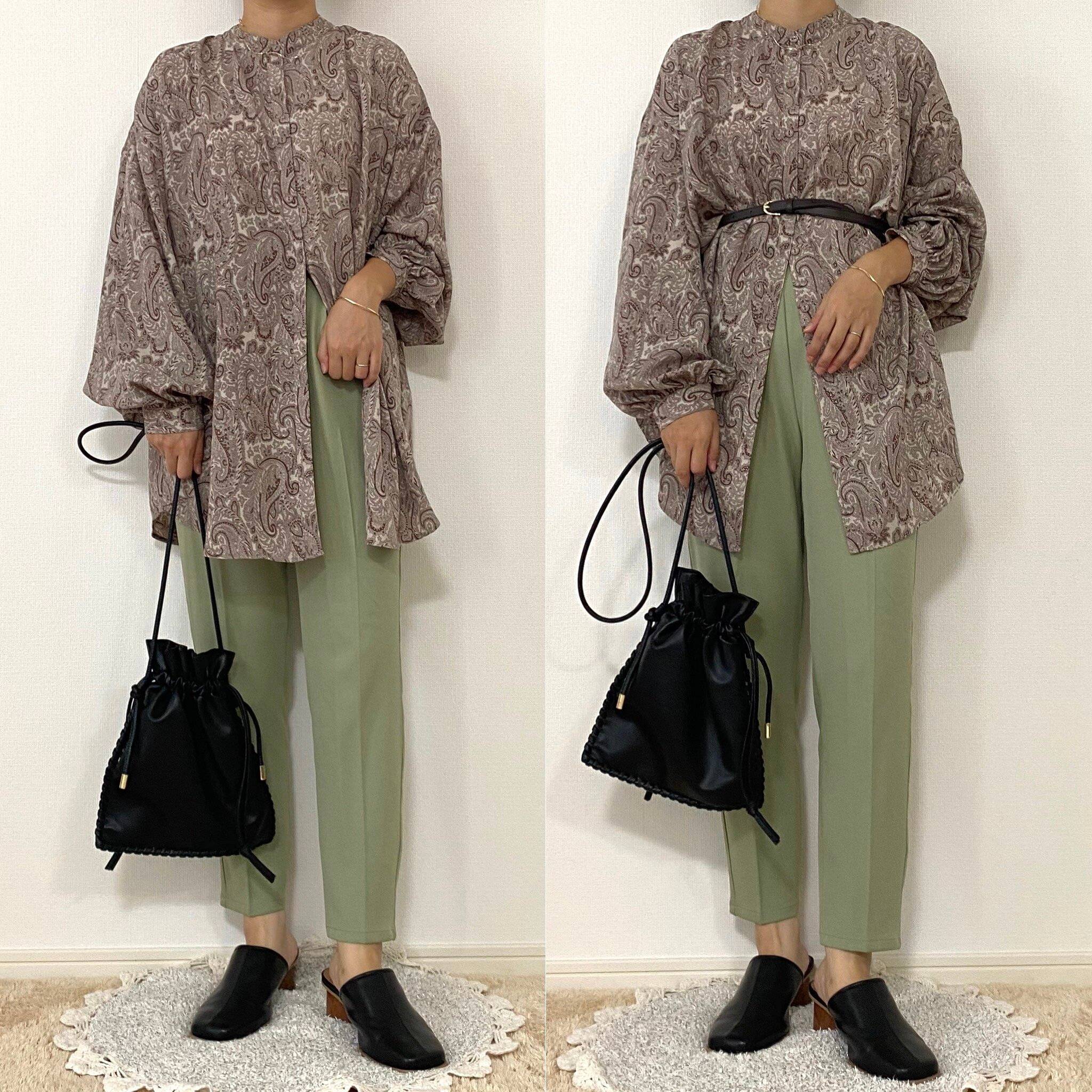 グリーンのテーパードパンツと合わせてみました。シャツが落ち着いたカラーなので無地のカラーアイテムとあわせてもいいですね。