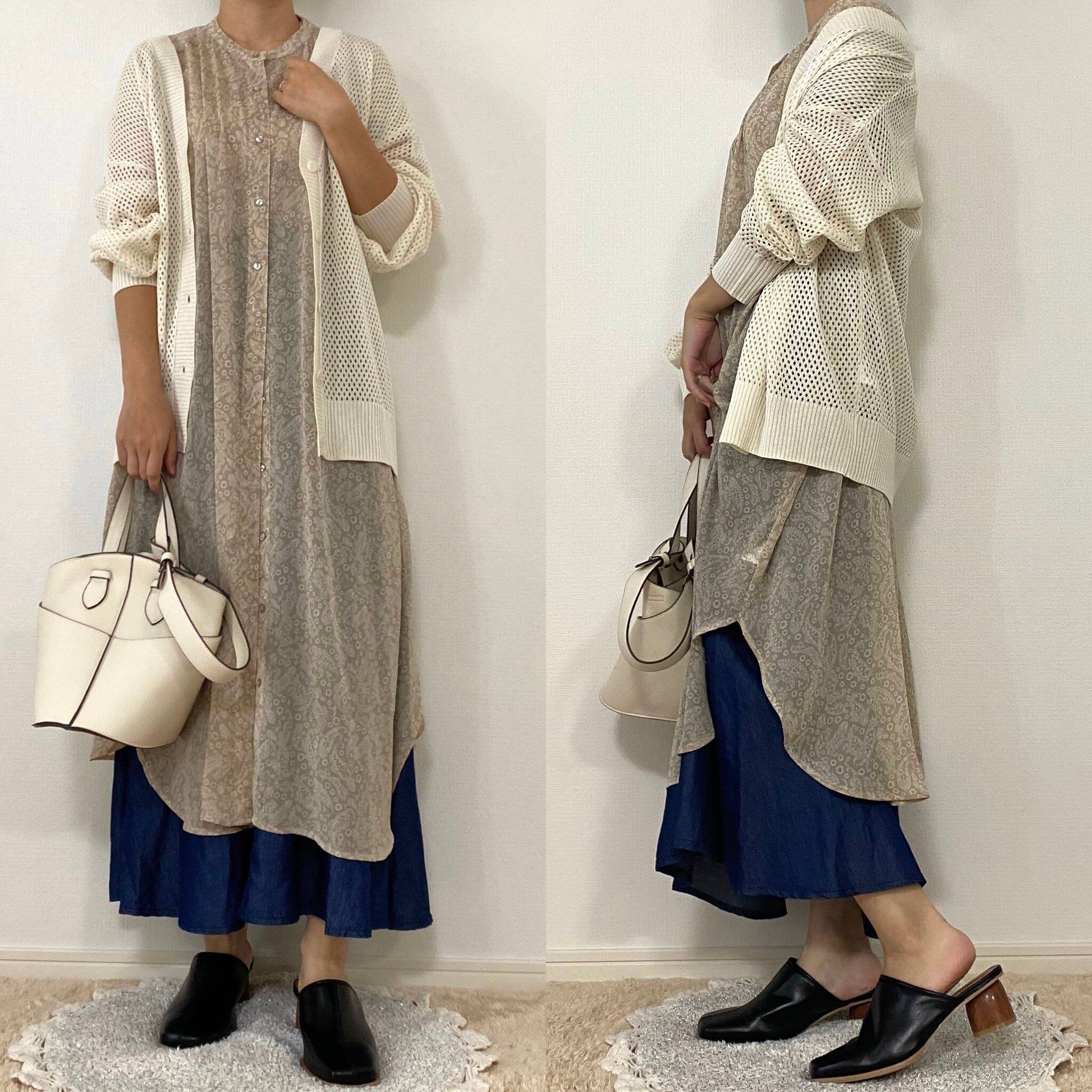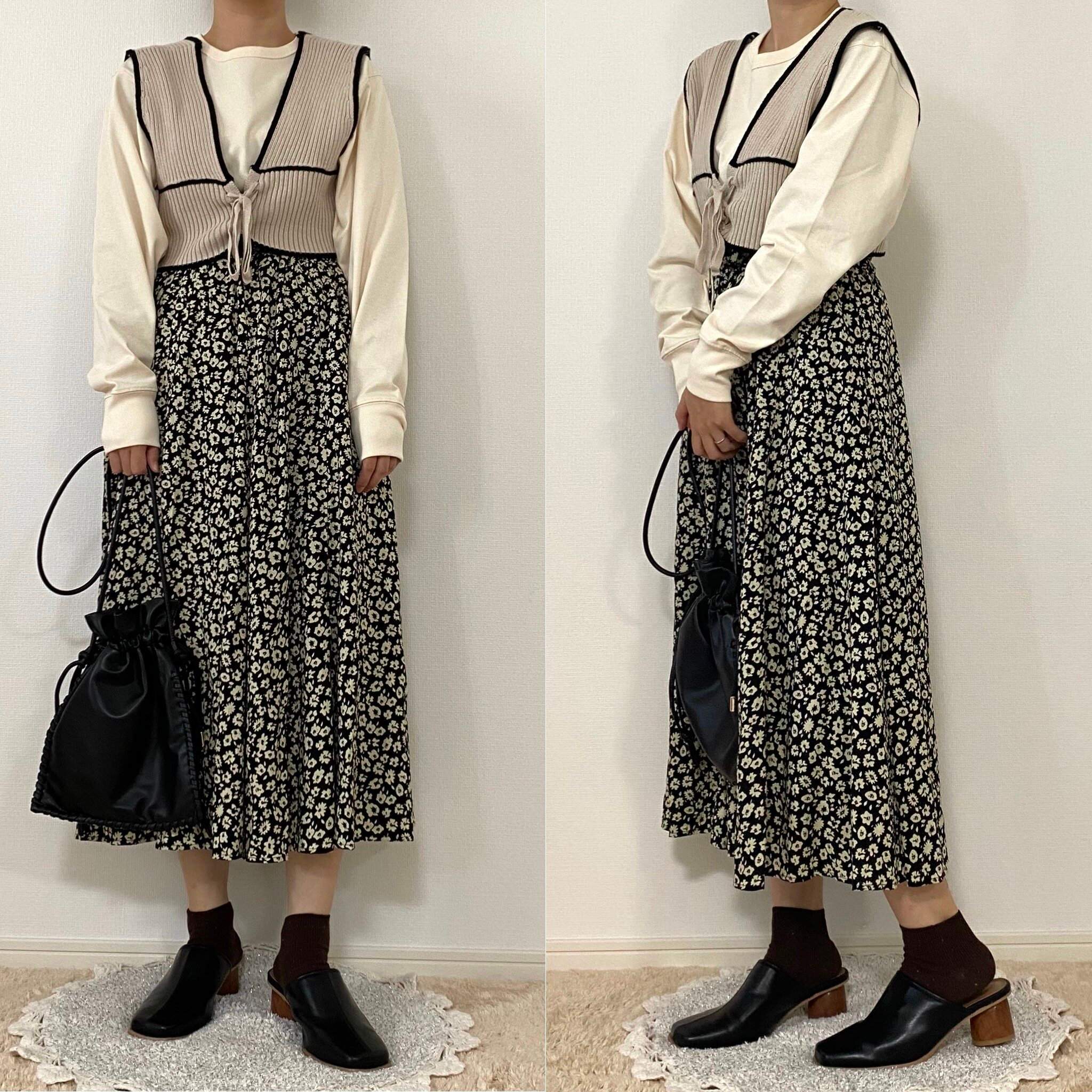 ふんわりワンピースのゆるっとレイヤードコーデには締め色として靴やバッグに黒のアイテムを持ってくるのがおすすめ!