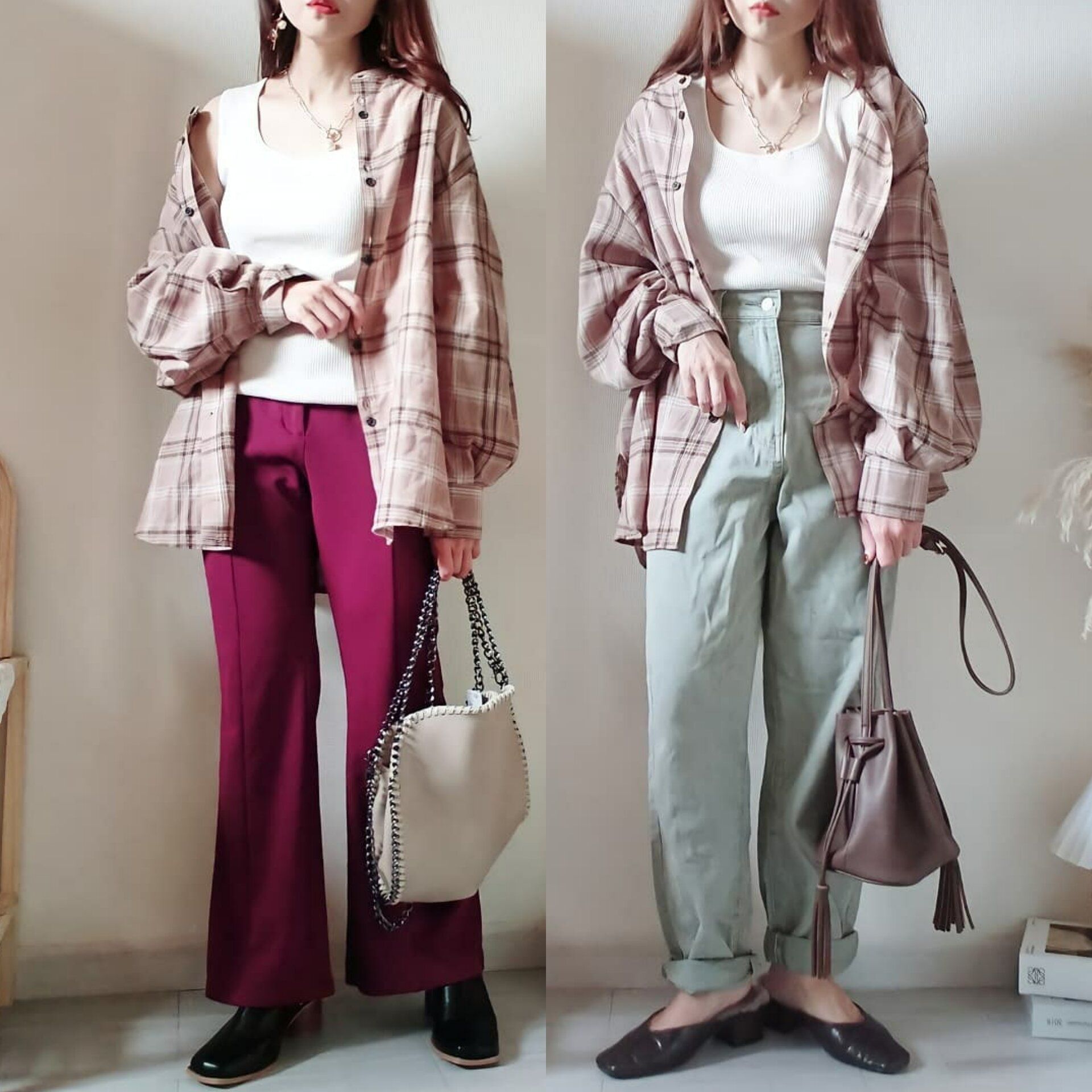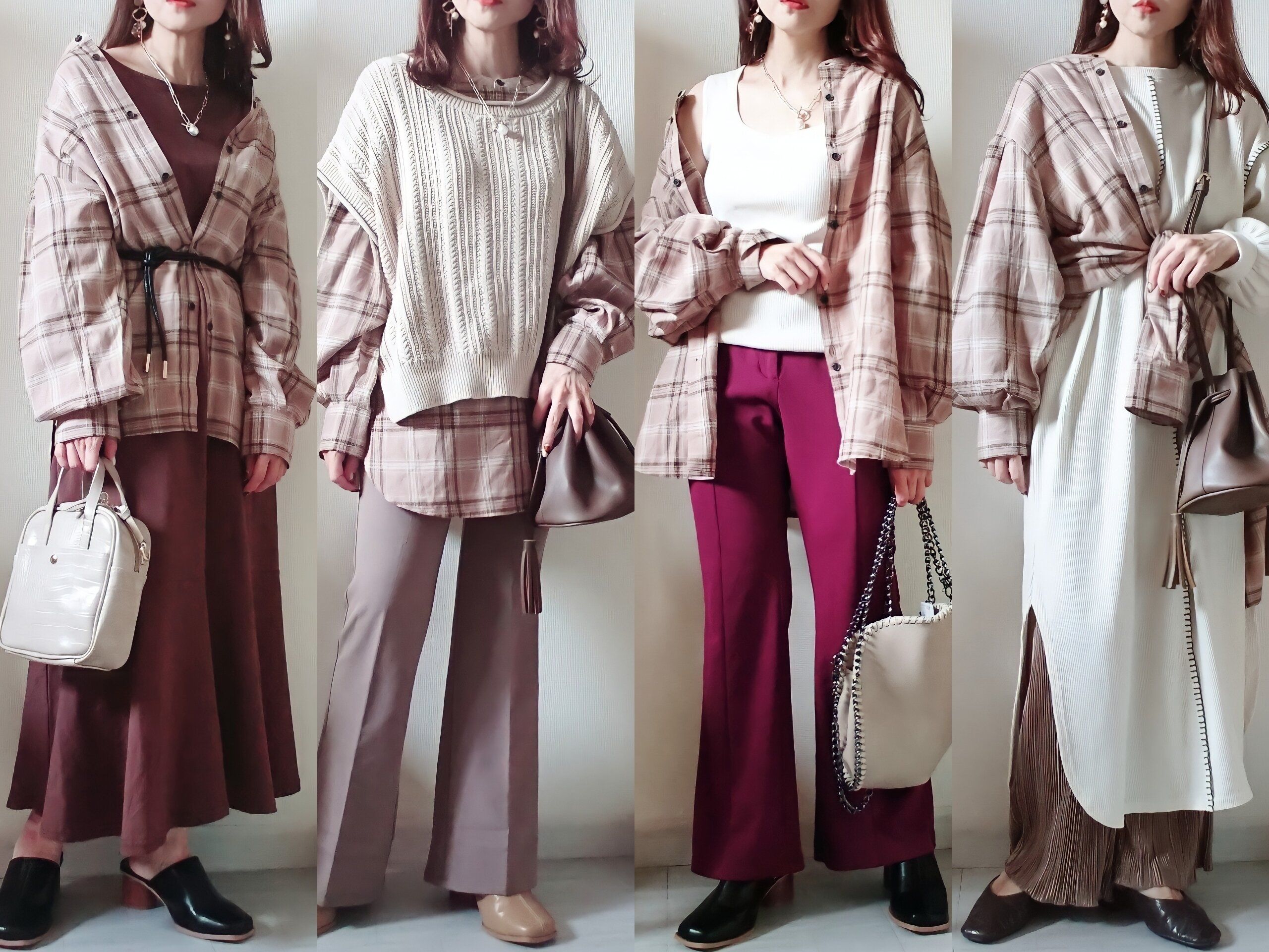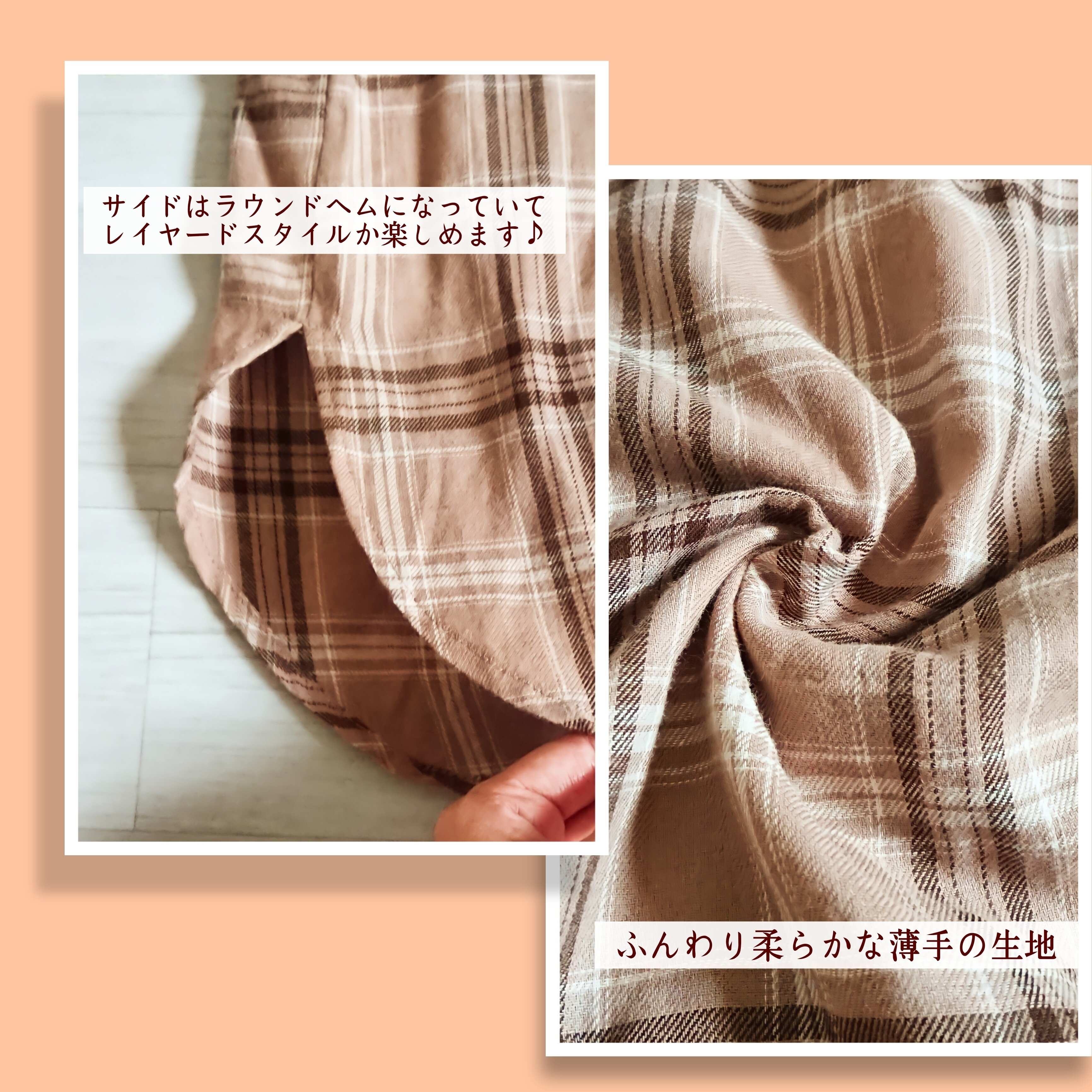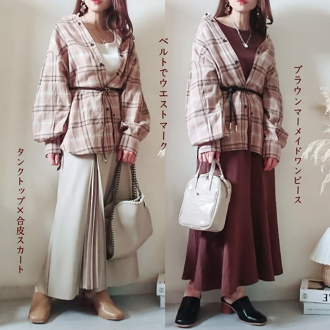 どちらのコーデもベージュのチェックシャツに馴染む淡色系カラーでまとめています。この方が抜け感が出てオシャレ度が増します!(ワンピース・しまむら)