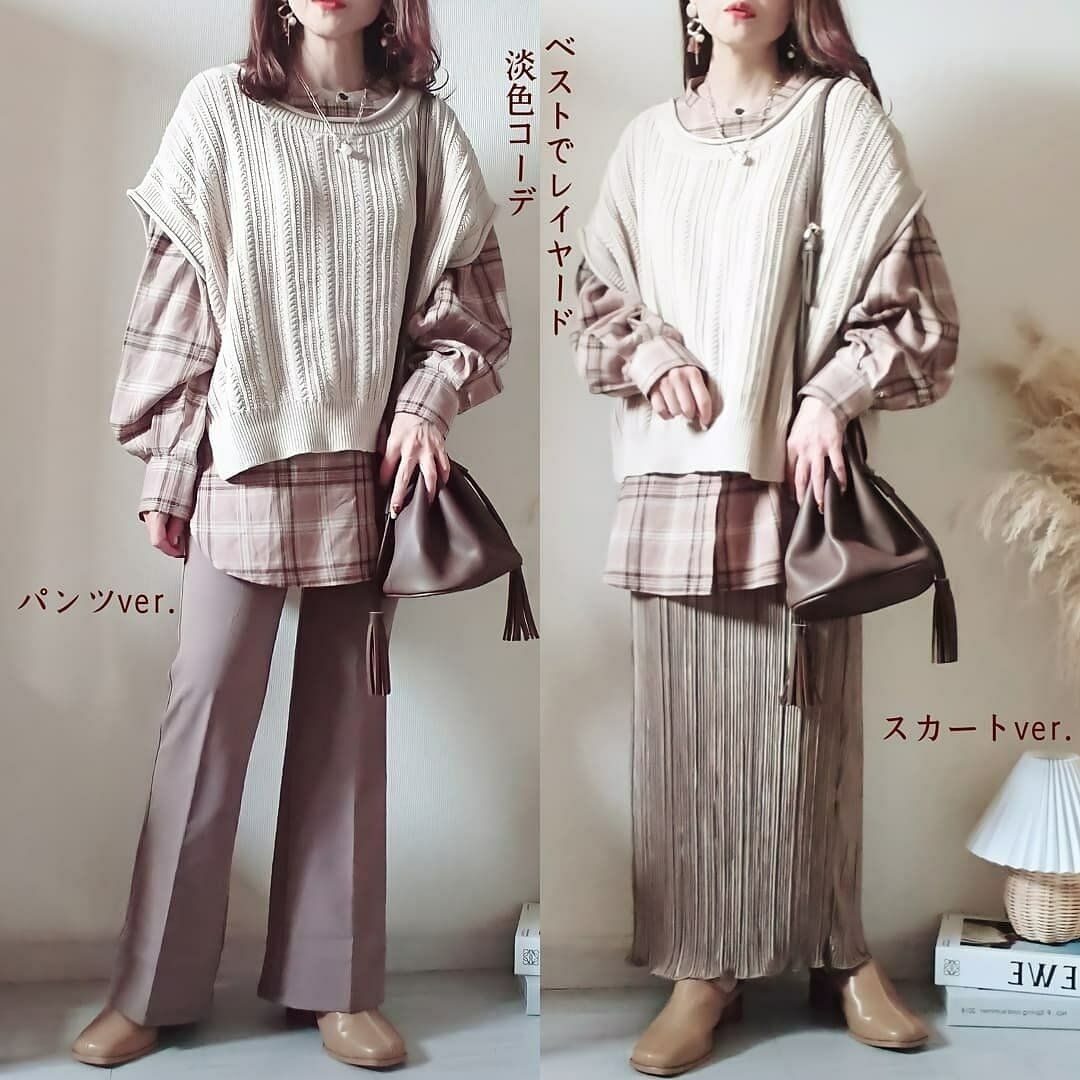 どちらも淡色系アイテムでまとめていますが、こちらのようなホワイト系ベストを着ることで全体ののっぺり感がなくなります。更に奥行きも出て、目線も上にいくので、低身長さんにおすすめしたいコーデです。