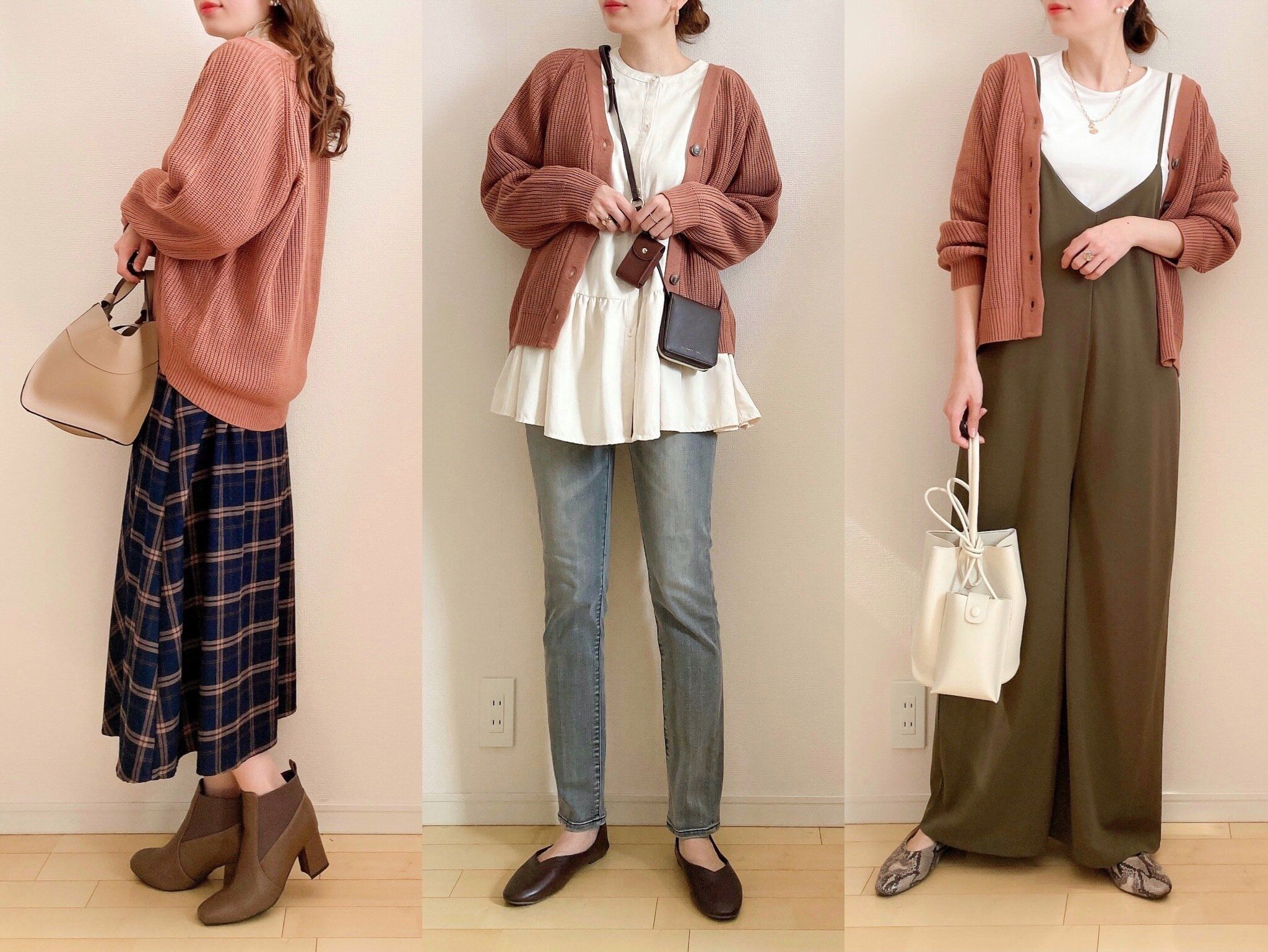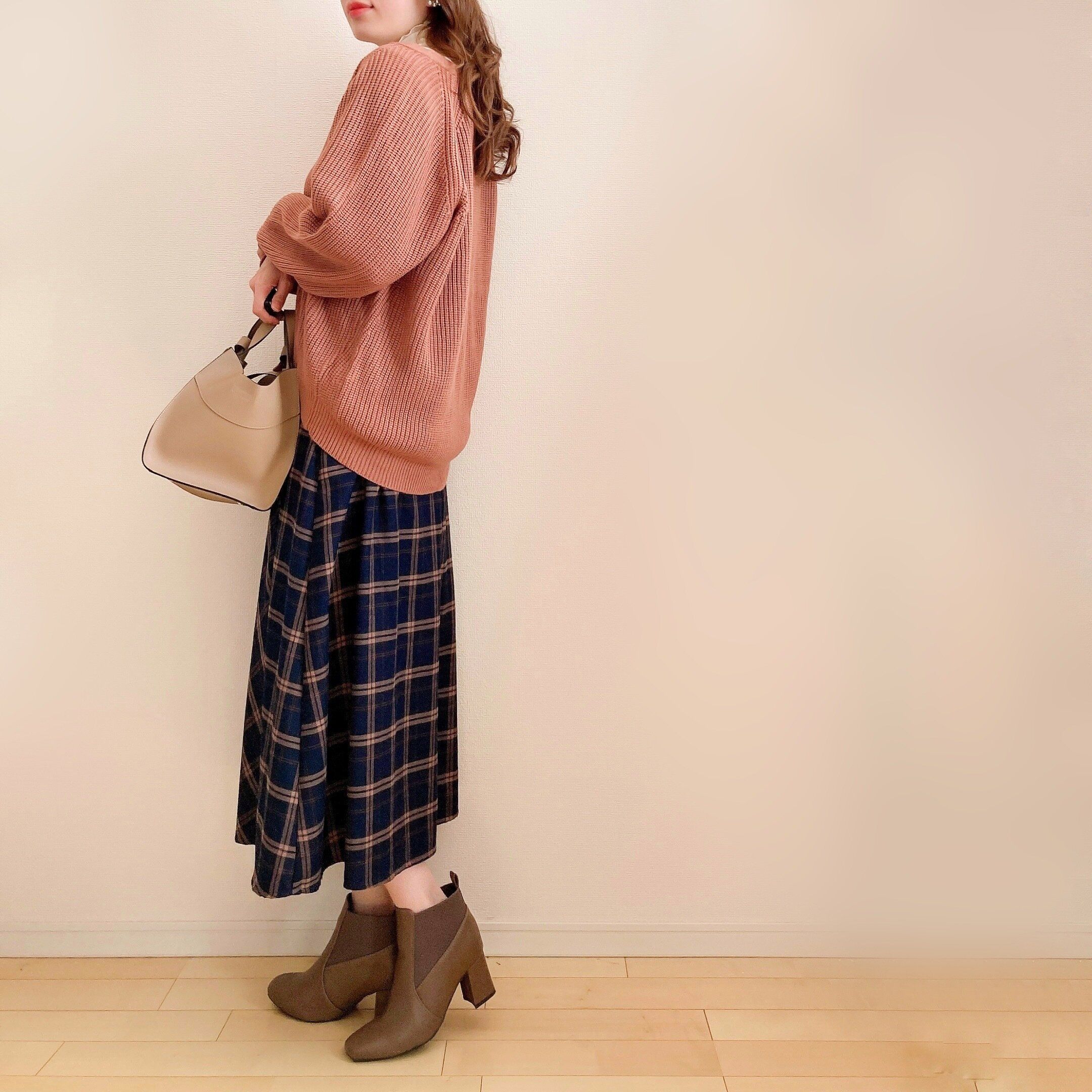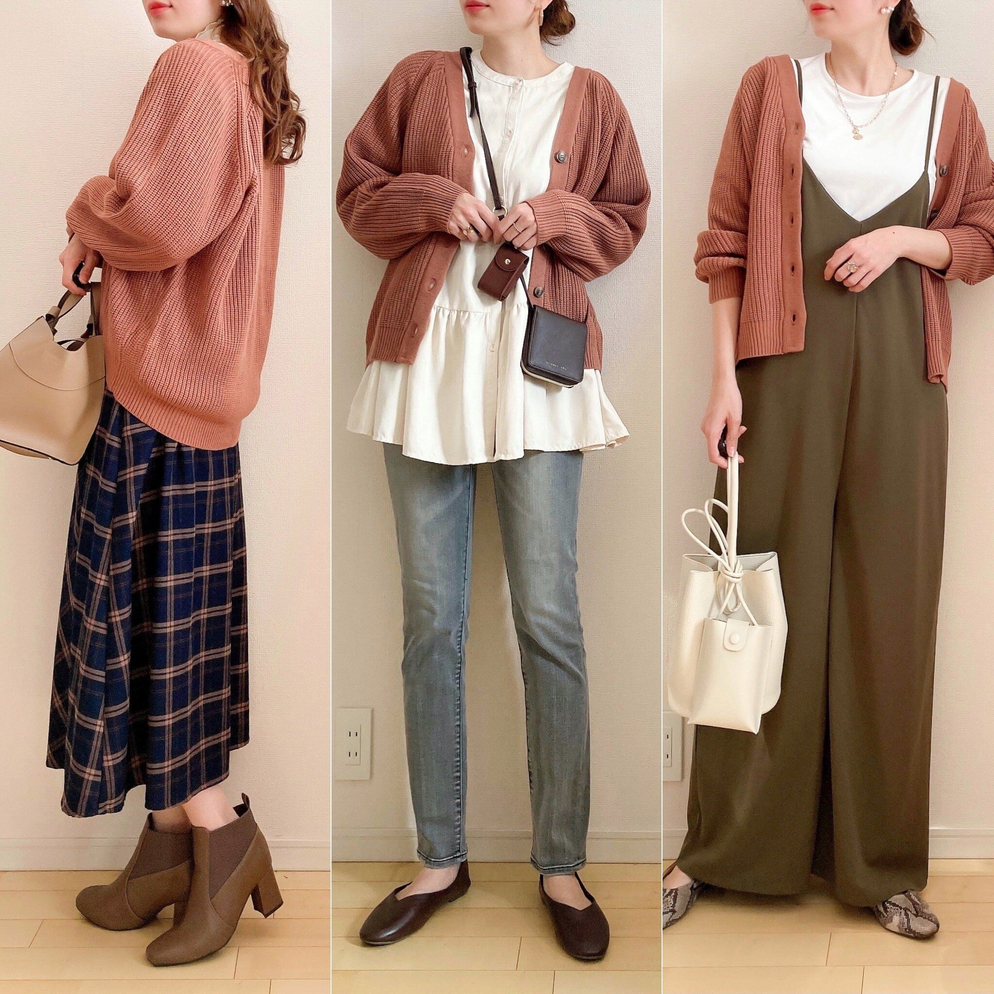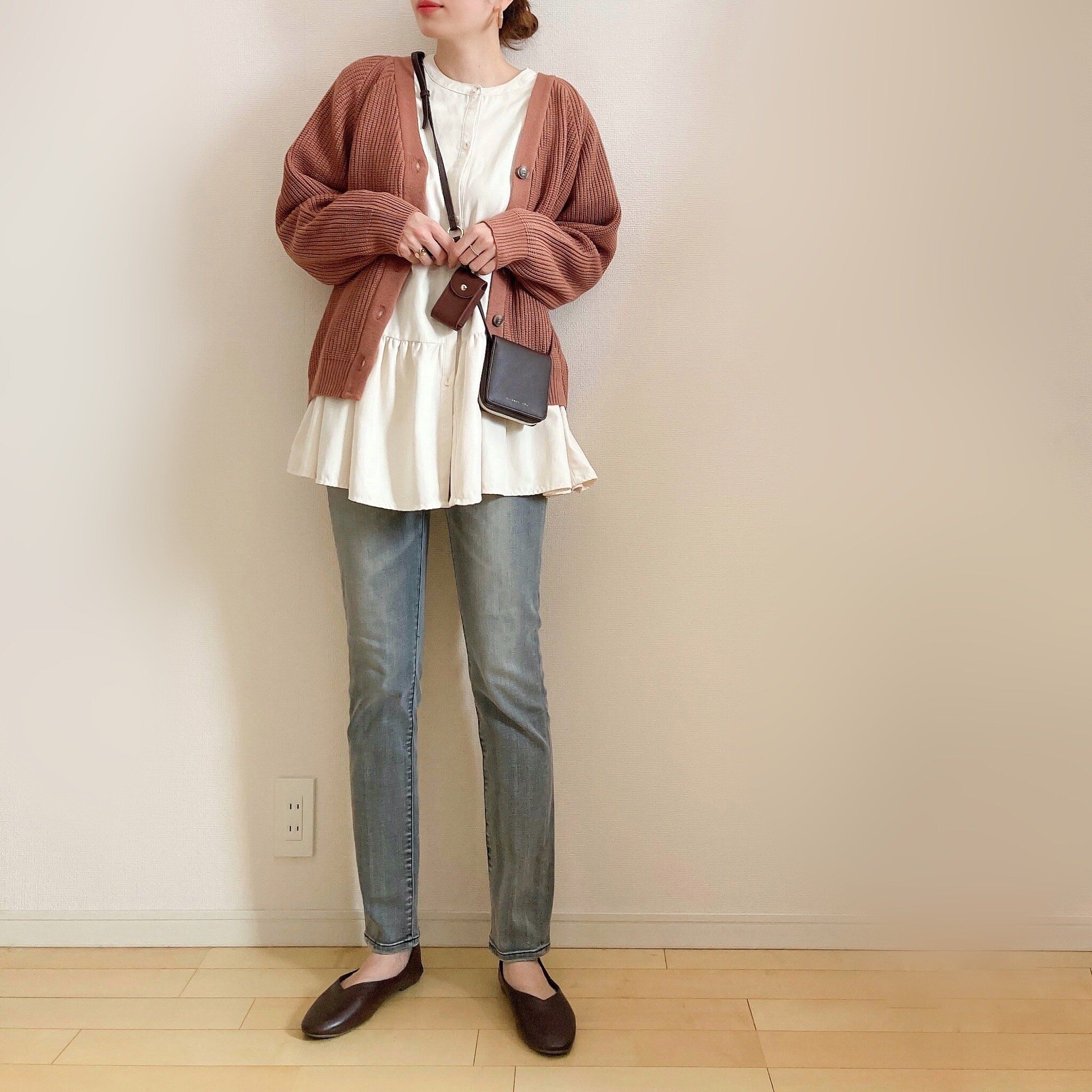 小物もベージュやブラウン系でまとめて、ほっこりとした女の子らしいコーデに。カーディガンの丸みを帯びた後ろ下がりのシルエットがとても可愛いですね。