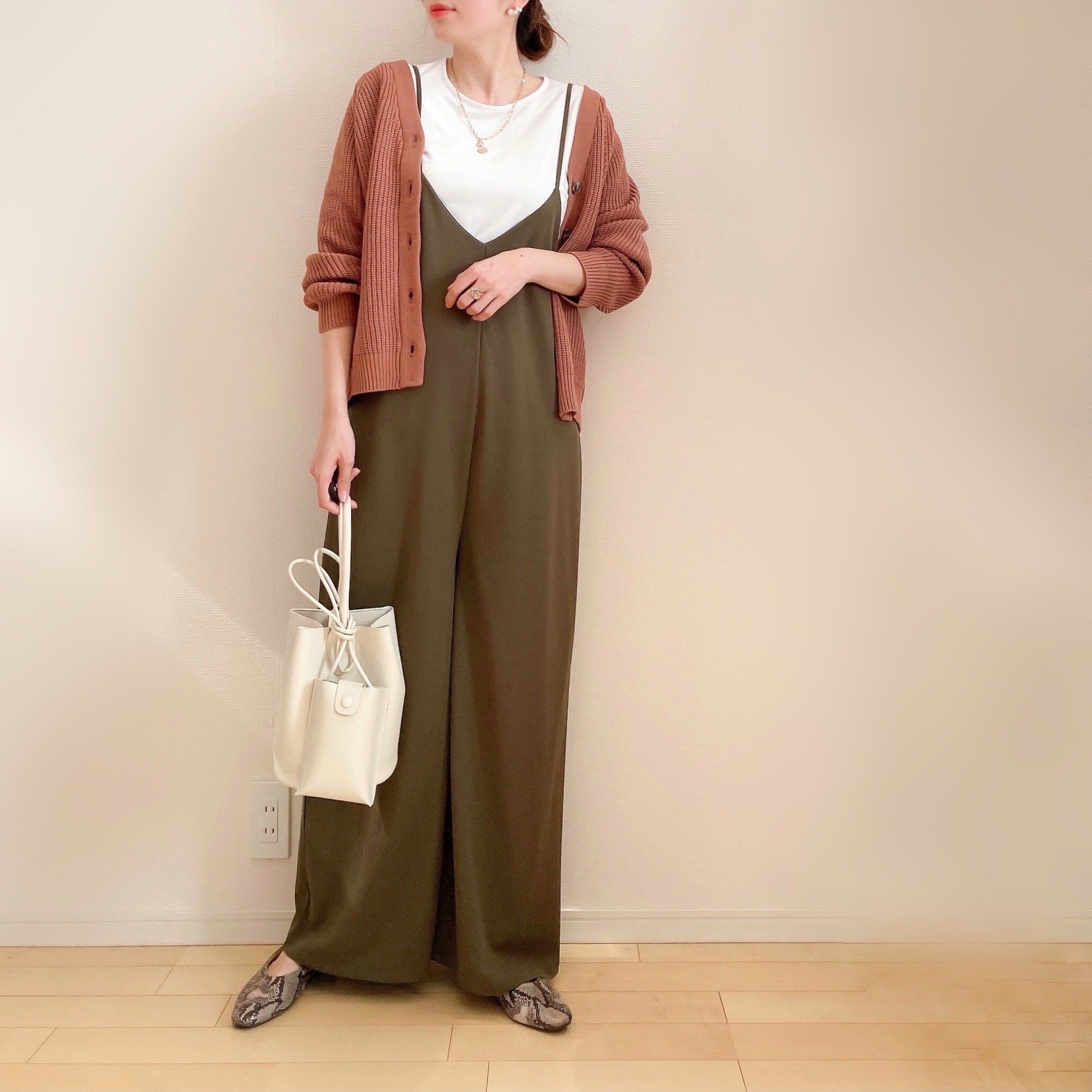 とろみのある落ち着いたカーキのサロペットと合わせてみました。オレンジピンクのカーディガンはアースカラーとの相性も抜群。カーキとの組み合わせは温かみがあり秋冬にぴったりです。足元にはパイソン柄を投入して少し辛口に。