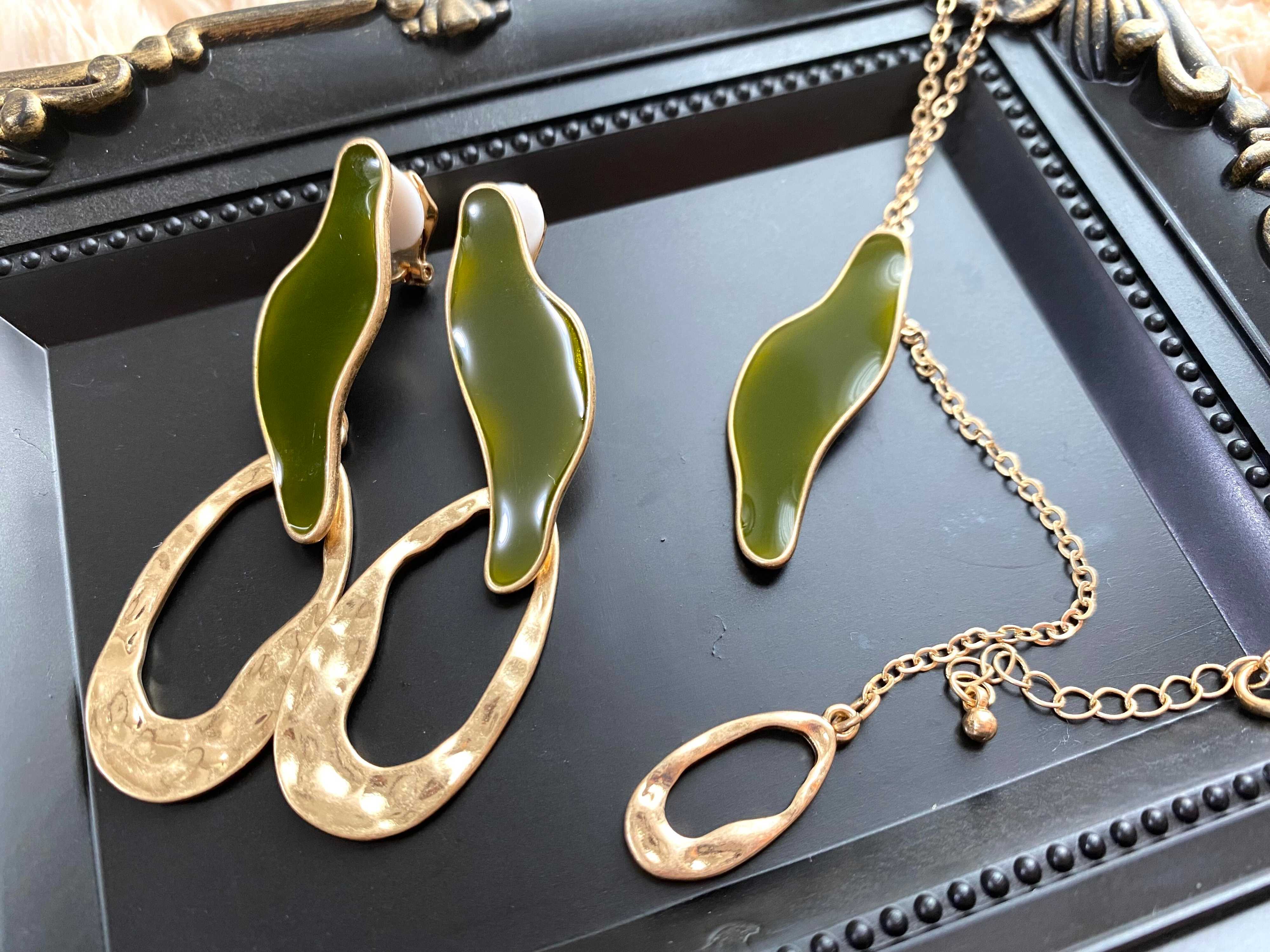 ダークグリーンの変形メタルプレートがポイントになったY字のロングネックレスです。
