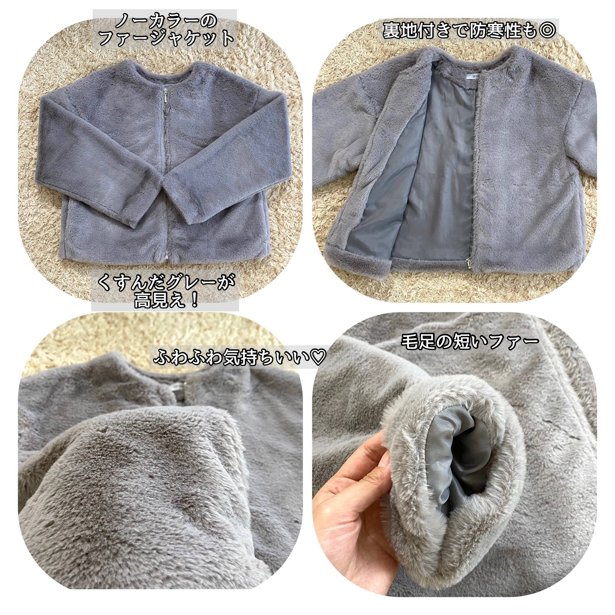 ノーカラーのファージャケットで裏地もちゃんと付いています。くすんだグレーが大人っぽく、店頭にはブラックなど他のカラーも並んでいましたよ!