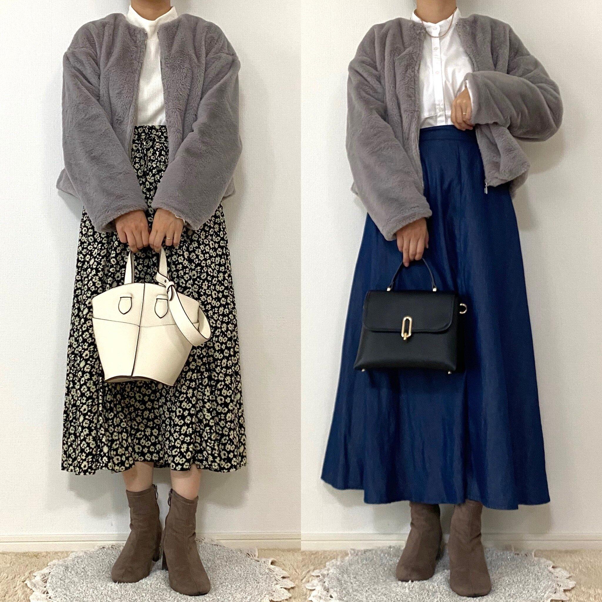 ファージャケットのフェミニンさを引き立てるスカートコーデはお出かけやデートにぴったり。ハイネックのトップスと合わせると、トレンド感もあり寒さ対策にもなります。