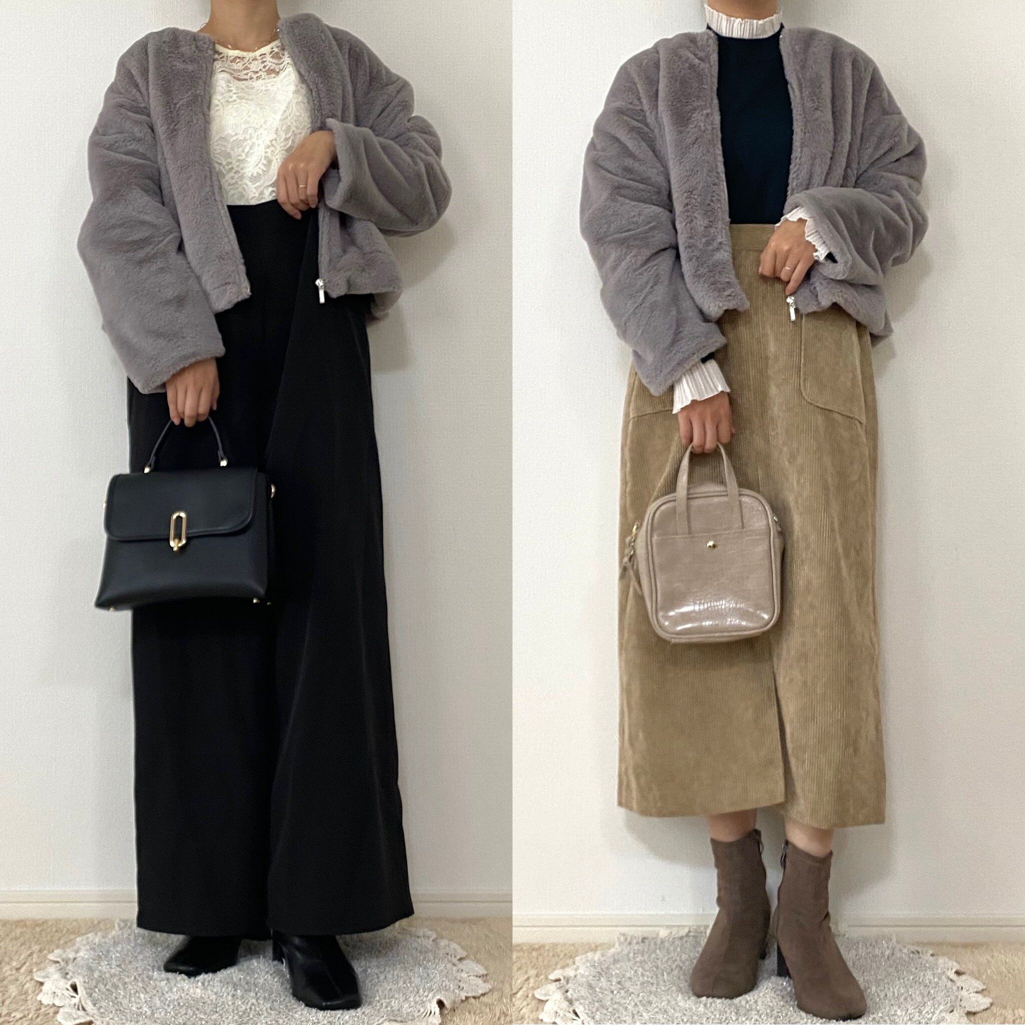左のコーデは中にレースのトップスを入れてバッグも綺麗めに。ファージャケットとレースで特別な日のお出かけスタイルにピッタリですね!