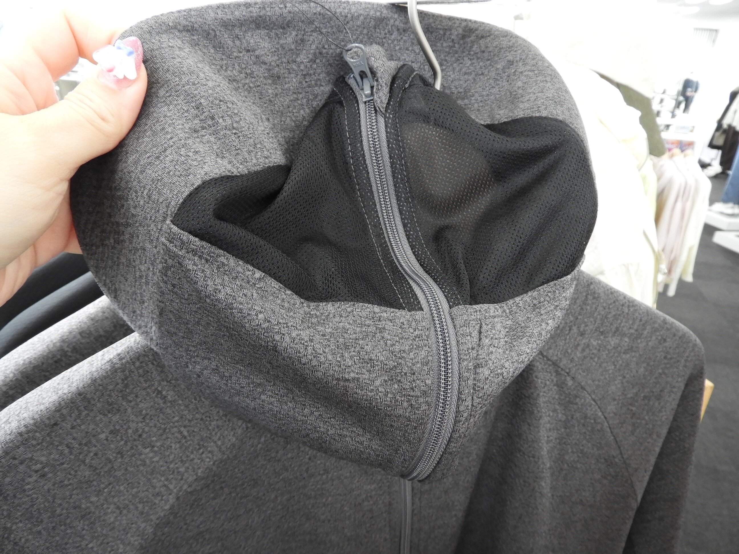 「クールUVサンシェードパーカーEX」の1番驚いたポイントが、顔全体を覆い隠せるフルジップ仕様。マスク部分が隠れるUV対策パーカーはすでにワークマンでも毎年人気の定番商品ですが、顔が覆い隠せるデザインは初めてだそう。目元はメッシュになっているので、着用している本人は見えています。完全装備の新アイテム、筆者も展示会後、実店舗で購入しました。