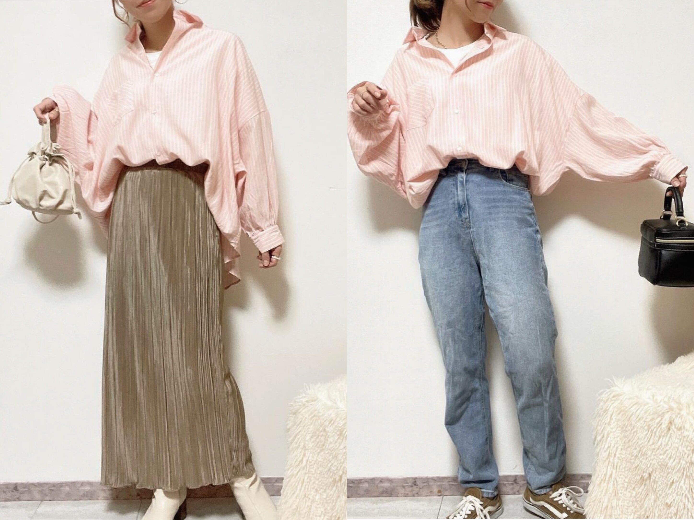 甘くなりがちなピンクのストライプシャツ。しかしコーディネート次第で、大人可愛くまとめることができそうです。