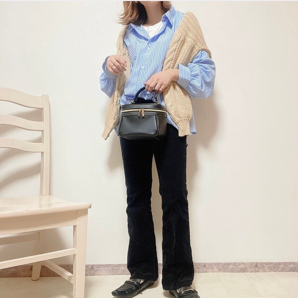 ブルーのストライプシャツはブラックのボトムスと相性バツグン。ブラックがシャープに全体を引き締めてくれます。カーディガンなどを肩掛けすると、こなれ感が出てトレンドライクなコーディネートが完成。
