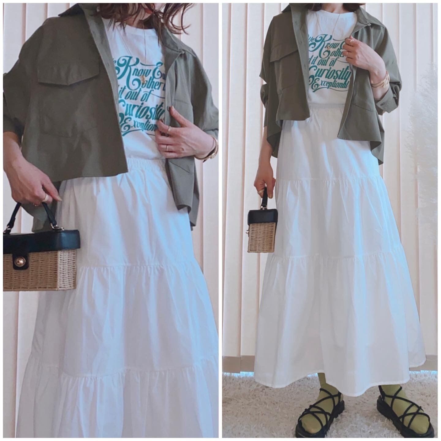 可愛いフォントのロゴTシャツ。グリーンカラーが今年らしいです。シンプルなので使いやすく、ポップな印象のロゴTですが、可愛いスカートと合わせてミリタリーシャツを羽織れば、甘辛ミックスコーデの完成!大人でも挑戦しやすいコーデだと思います。