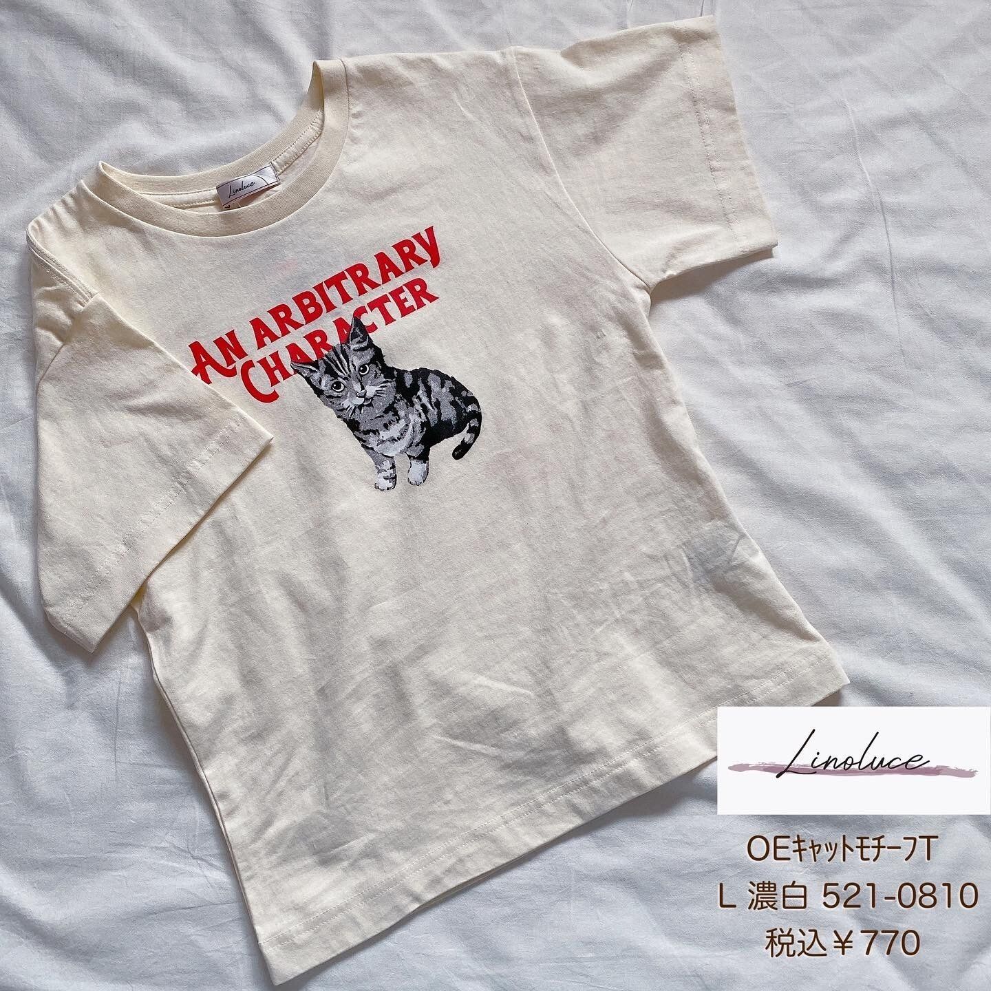 犬に続き、最後は猫のモチーフTシャツ。この猫も可愛いんです。生地が真っ白ではなく、キナリのような色味になっているのも惹かれたポイントです!肌馴染みがよく、柔らかい印象にしてくれるTシャツです。
