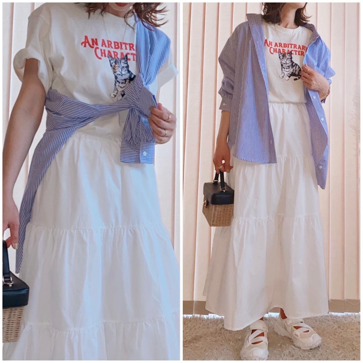 トレンドのストライプシャツと合わせるのがオススメです!また、シャツを襷掛けすると一気に垢抜けコーデの完成です。