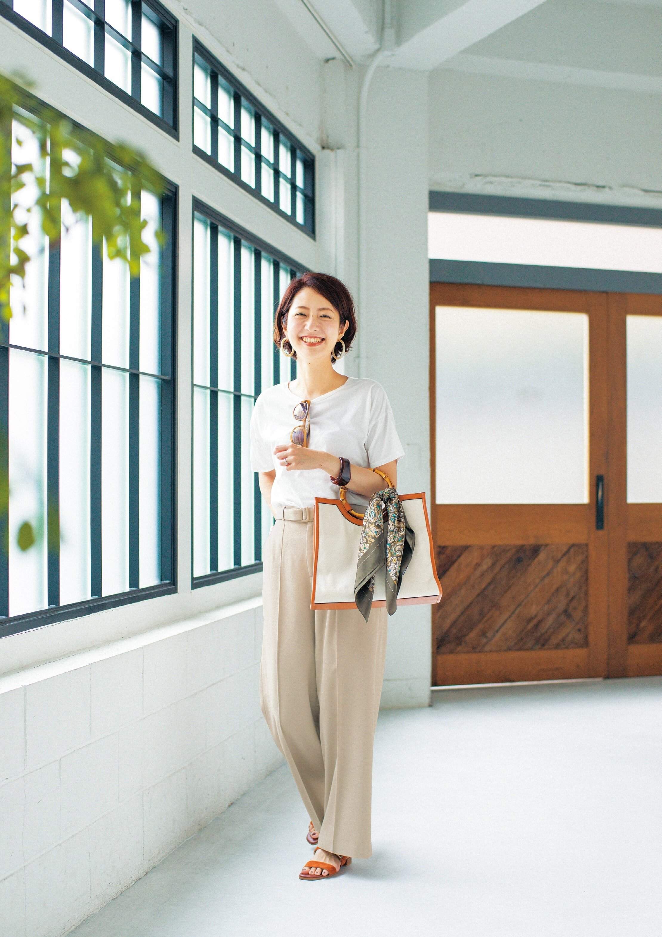 「このパンツは、白にも黒にもマッチする絶妙な明るさのベージュが素敵」。真夏は白のトップスを、秋の気配を感じたら黒のトップスや小物を合わせるだけで季節を先取りできる。