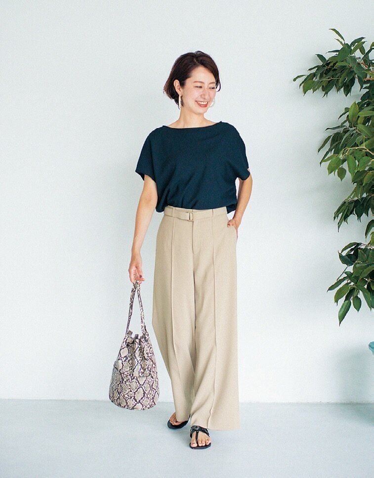 真夏はおしゃれよりもついついラクな着心地を優先しがち。それでもおしゃれに見せるコツは?「いつもの白Tにジーンズではなく、サンドベージュのワイドパンツを組み合わせる。これだけでこなれた雰囲気になります。このパンツはウエストがゴムなのに、共布のベルトがついているから、ラクなのにきちんと見える。まさに40代向けの1本です」。