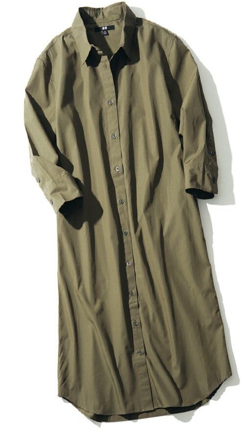 夏は、はおり物代わりにも使えるシャツワンピ。無難な黒よりブラウンが断然おしゃれ見え。七分そでなので1枚で着ても抜け感が出せる。