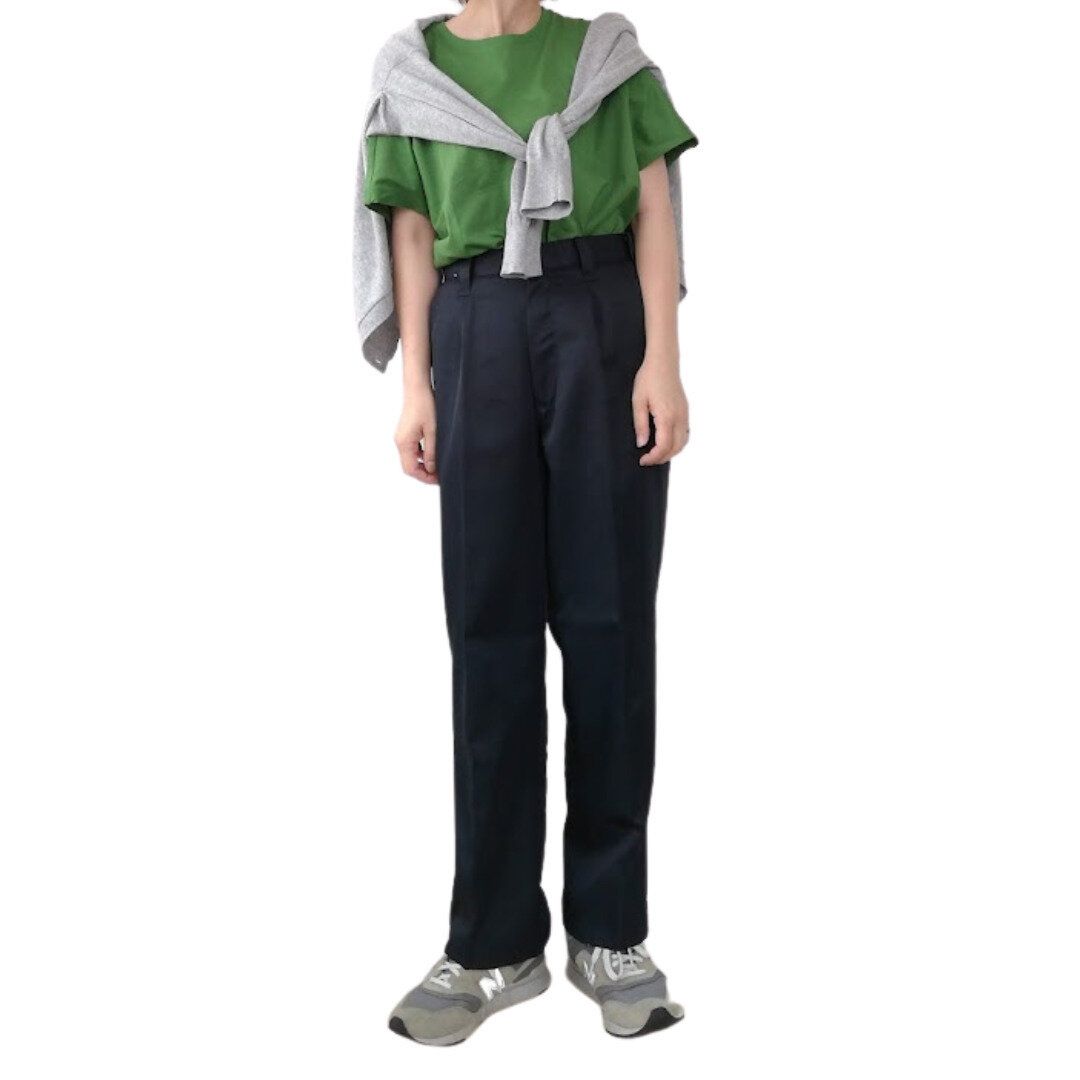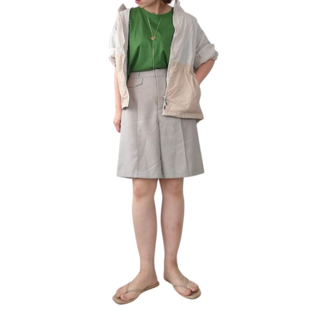 グリーン×ネイビーの落ち着いたトーンで、見た目にも涼しげな夏スタイル。