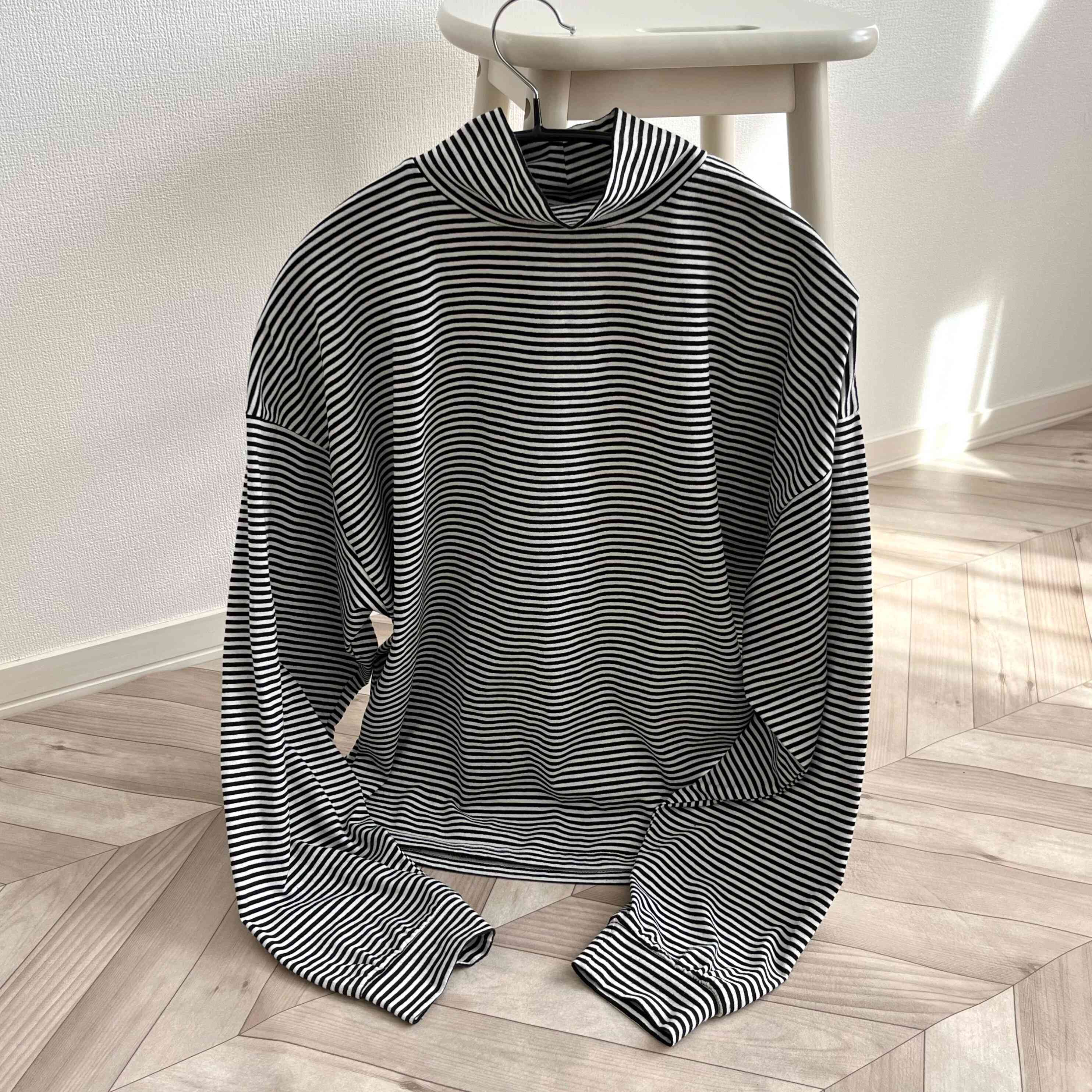 黒のタートルネックをレイヤードしても間違いないですが、ボーダーを入れることで一気にこなれ感が出る気がします。
