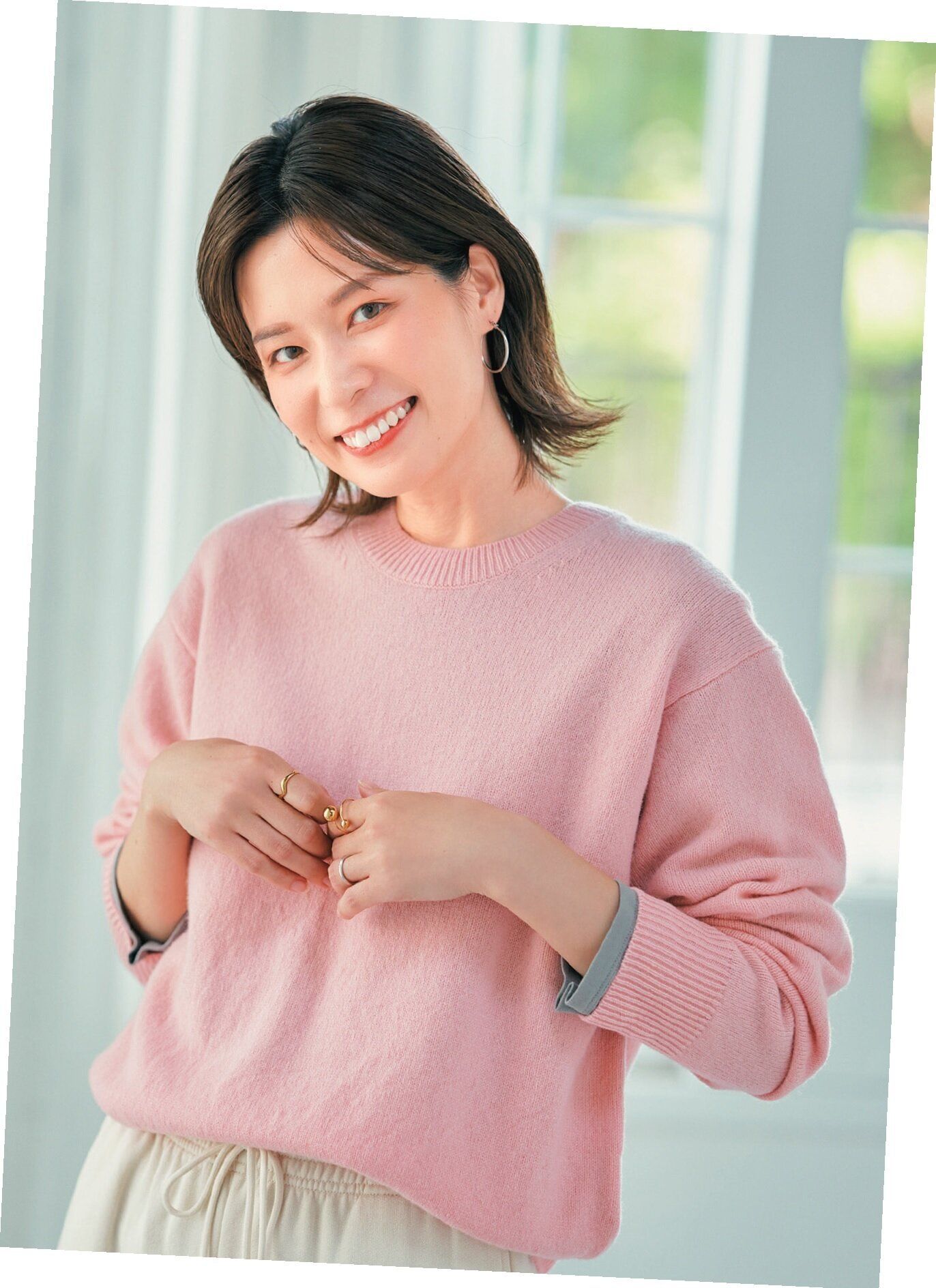 カットソーをINして襟や手首からチラ見せすると、シンプル過ぎずに今っぽく。プレミアムラムクルーネックセーター¥2,990、カットソー¥1,990、パンツ¥2,990/ユニクロ ピアス¥3,150/アビステ その他/私物