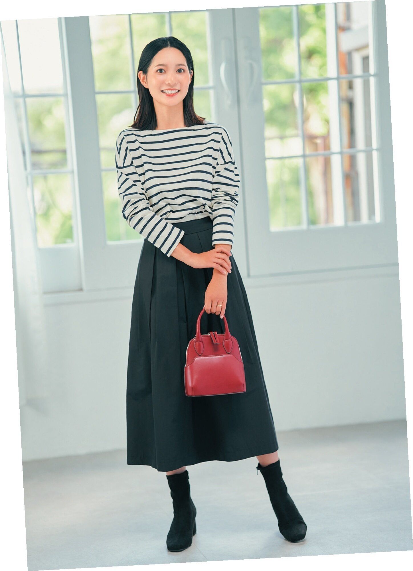 今シーズンは小さめのボストン型に注目。取り外し&長さ調節可能なショルダーベルト付き。ボストンミニショルダーバッグ¥2,490、スカート¥2,490、靴¥3,990/ジーユー カットソー¥1,990 /ユニクロ その他/私物