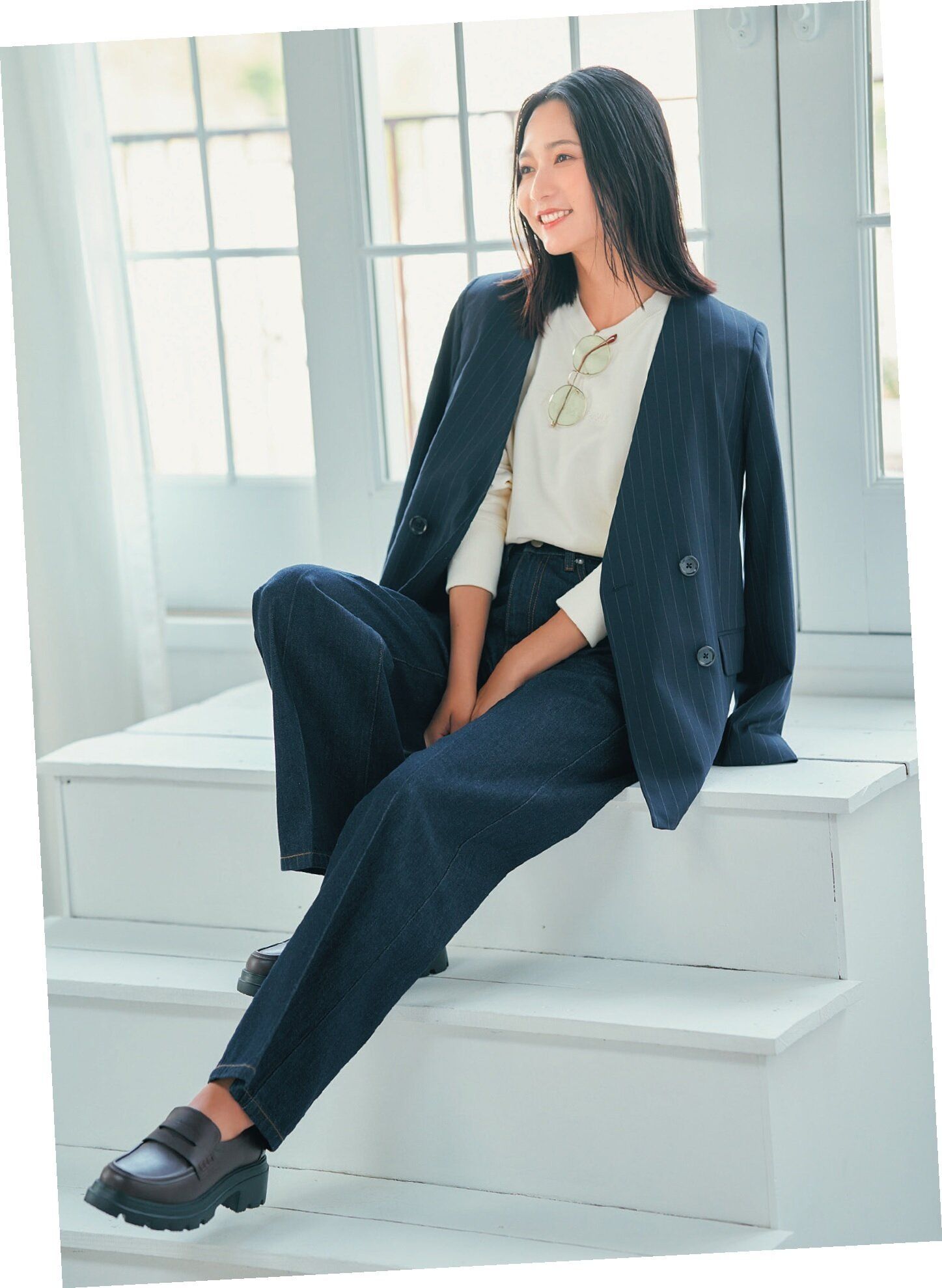 最旬の厚底靴は、上品なダークブラウンのローファーをセレクト。ジャケットやパンツと合わせてトラッドに仕上げて。