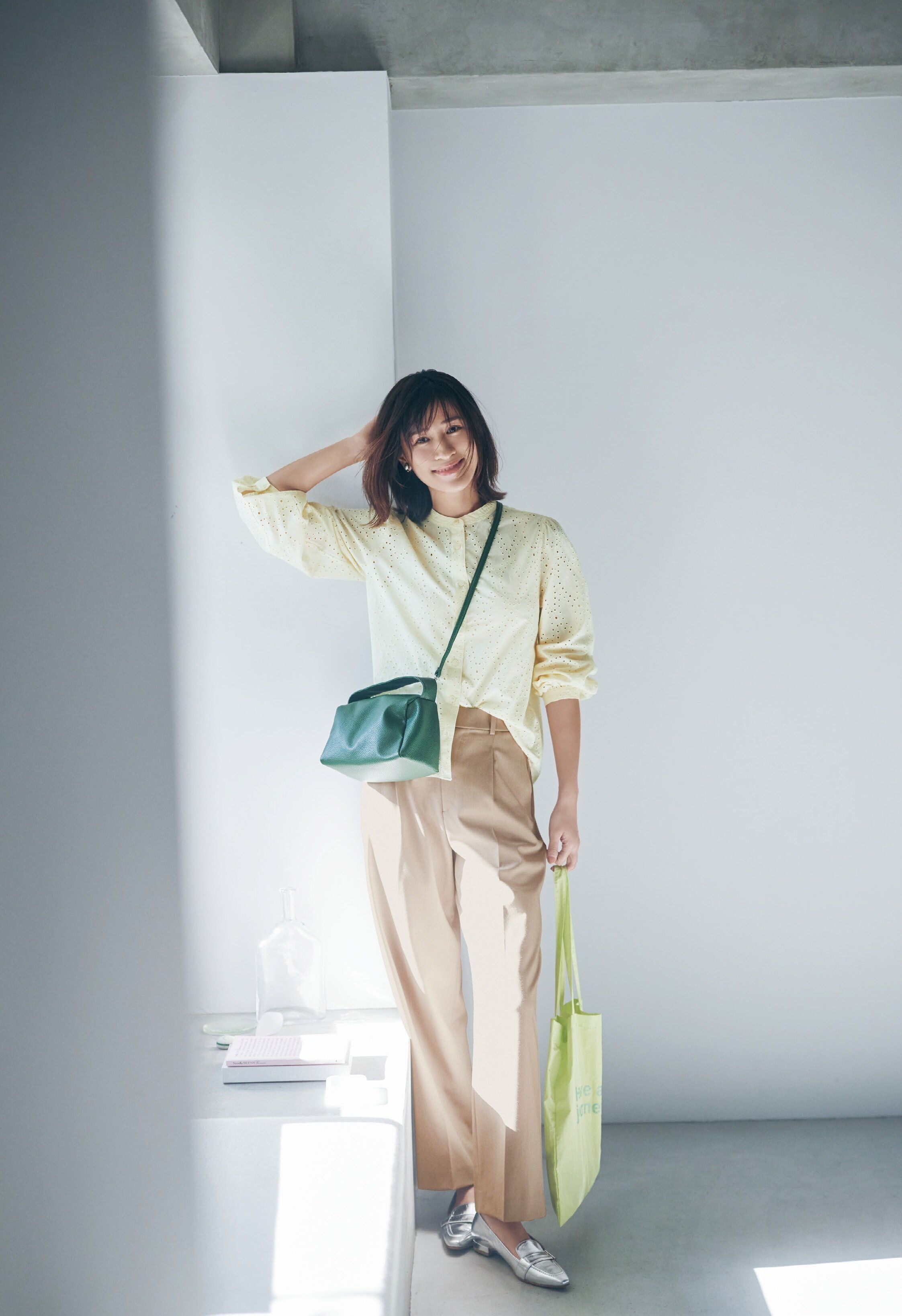 サンキュ!アンバサダー 山内藍さん コットンエンブロイダリーブラウス¥2,990、タックワイドパンツ¥3,990/ユニクロ(TEL 0120・170・296) イヤリング¥11,340 /アビステ(TEL 03・3401・7124) ショルダーバッグ¥2,690 /神戸レタス(https://www.lettuce.co.jp/) メッセージ トートバッグ¥590 /ジーユー(TEL 0120・856・452) ローファー¥18,150/ダイアナ(ダイアナ 銀座本店TEL 03・3573・4005)