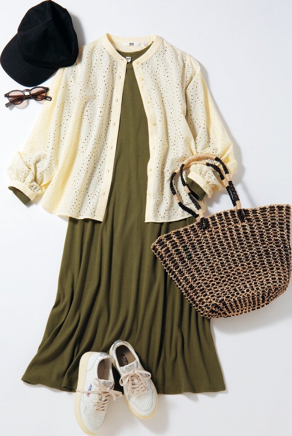 リブフレアワンピース¥2,990、UVカットツイルキャップ¥1,990 /ユニクロ サングラス¥48,400 /アイヴァン(アイヴァン 東京ギャラリーTEL 03・3409・1972) バッグ¥14,300 /バグマティ(ビーミング ライフストア by ビームス ららぽーとTOKYO-BAY店TEL 047・436・6500) スニーカー¥37,400 /オートリー(トヨダトレーディング プレスルームTEL 03・5350・5567)