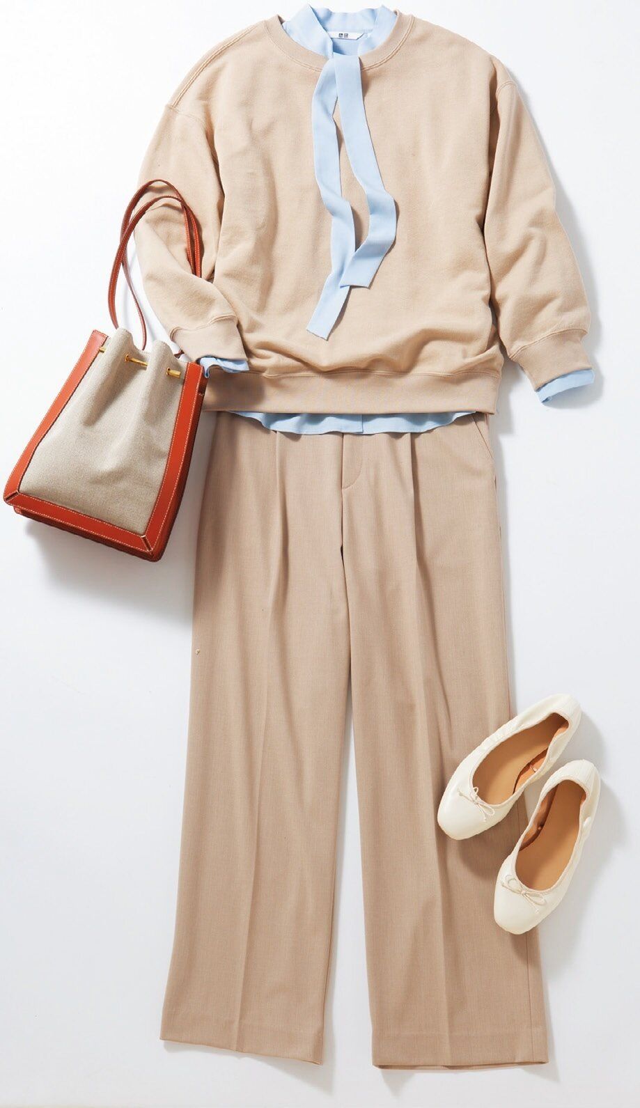 上品なベージュのスウェットのインナーにブルーのボウタイブラウスを仕込めば、コンサバすぎないお仕事コーデが完成。